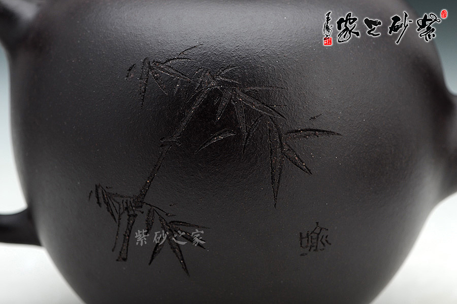 B面: 裝飾: 竹韻 裝飾者:喻繼高 裝飾內(nèi)容: 壺身反面篆刻的是一支竹,蒼翠清幽,清麗脫俗。
