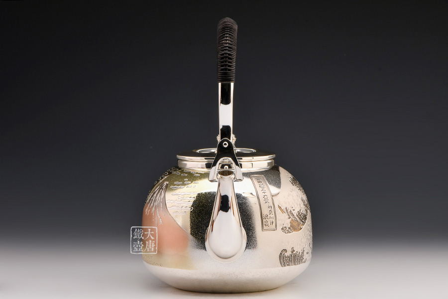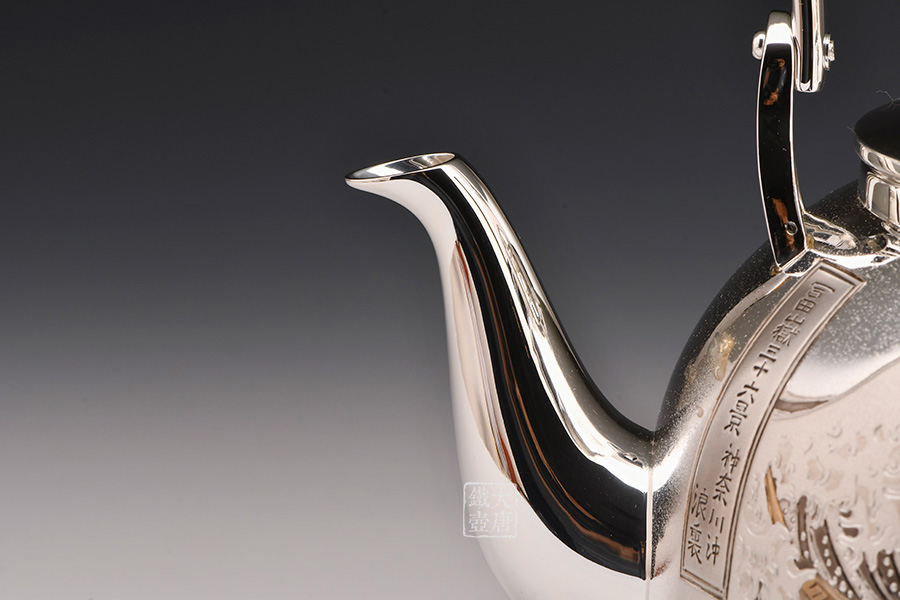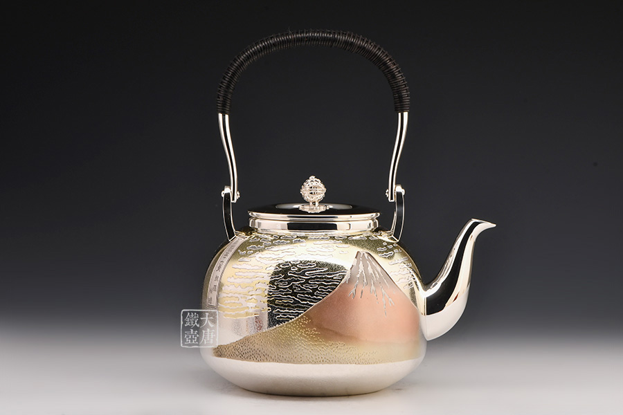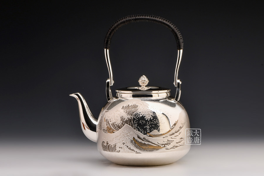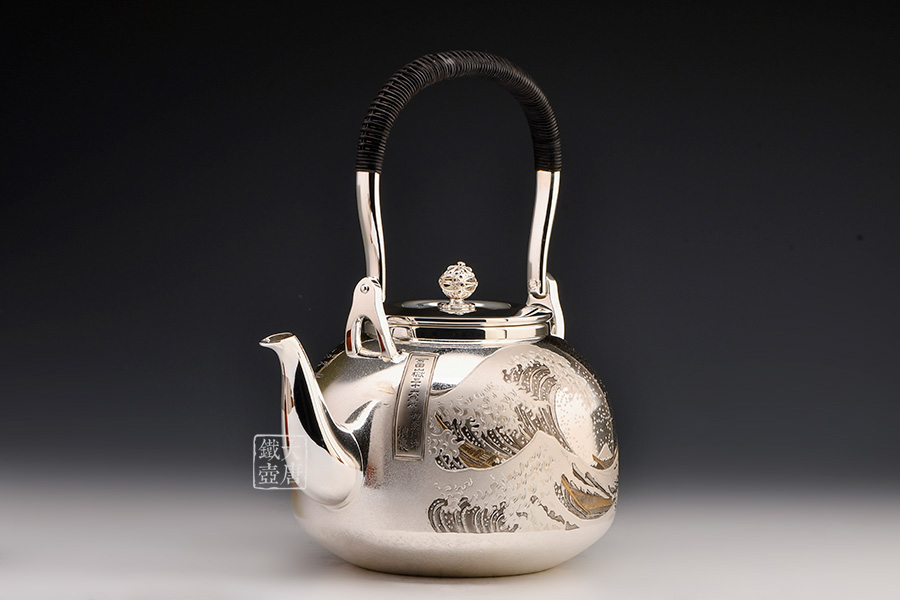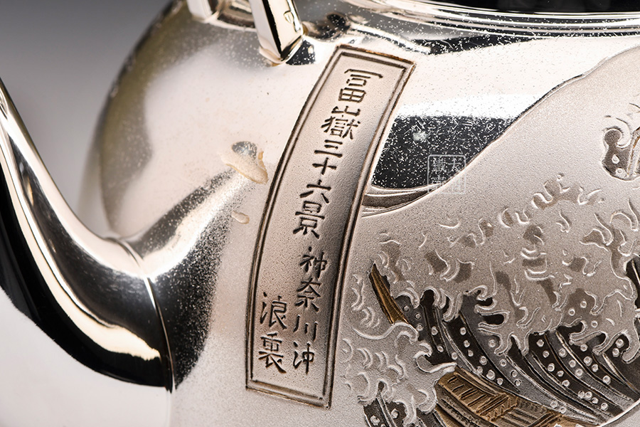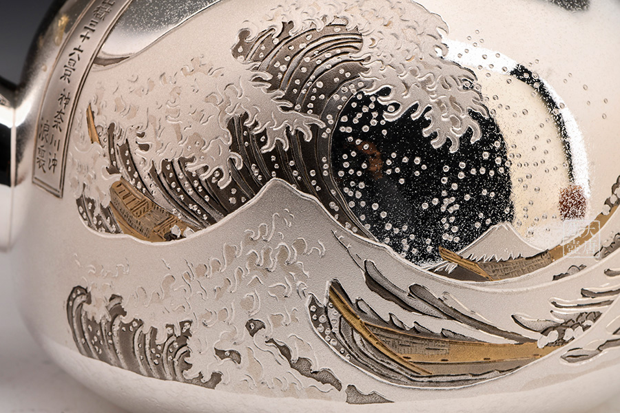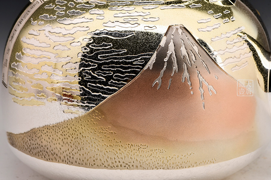 此款銀壺除了無與倫比的做工以外,壺身采用的是難度極高的手工剃刻與日本獨(dú)有的彩金鍍金工藝,將日本著名浮世繪畫家葛飾北齋的《富岳三十六景》中的《神奈川沖浪里》、《凱風(fēng)快晴》完美展現(xiàn)在壺身,這兩幅繪畫與《山下白雨》并稱為葛飾北斎的三大傳世名作。集實(shí)用,觀賞,收藏為一體的純手工日本銀壺實(shí)屬罕見,強(qiáng)烈推薦入手。