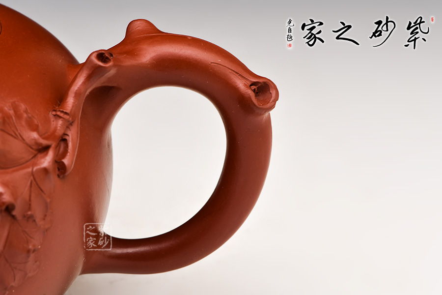 整器飽滿?圓潤。壺嘴、端把為虬曲的葡萄藤,一側(cè)逸出枝?葉,上掛葡萄,紋理分明、清晰細(xì)膩、逼真自如。壺鈕也為葡萄藤樣,藤蔓彎曲,筋、葉、果貼塑壺蓋,栩栩如生。