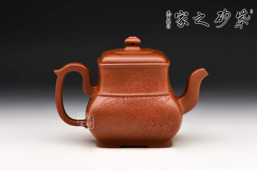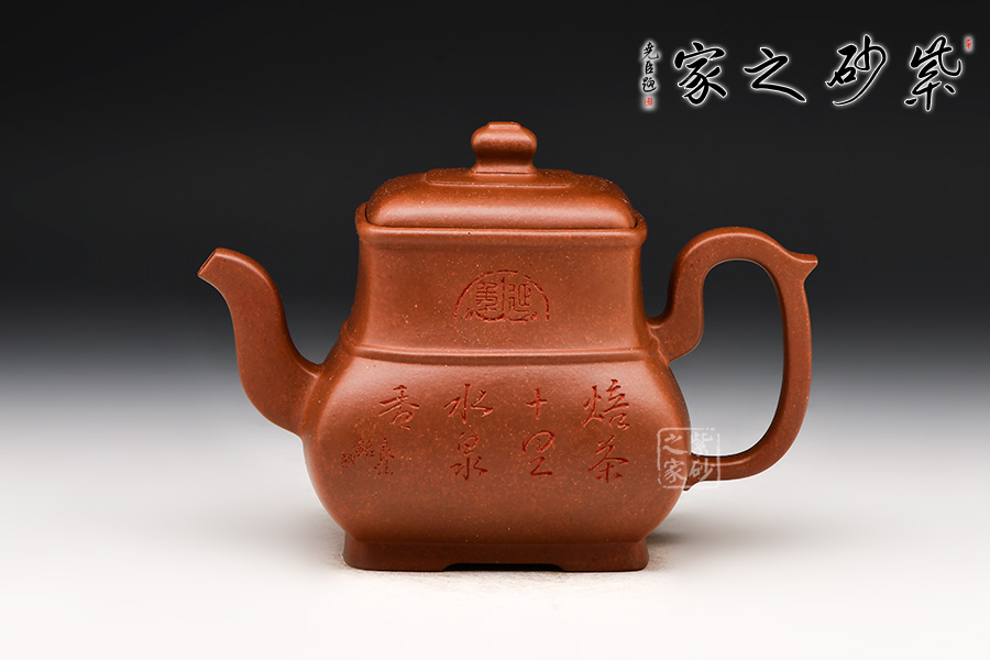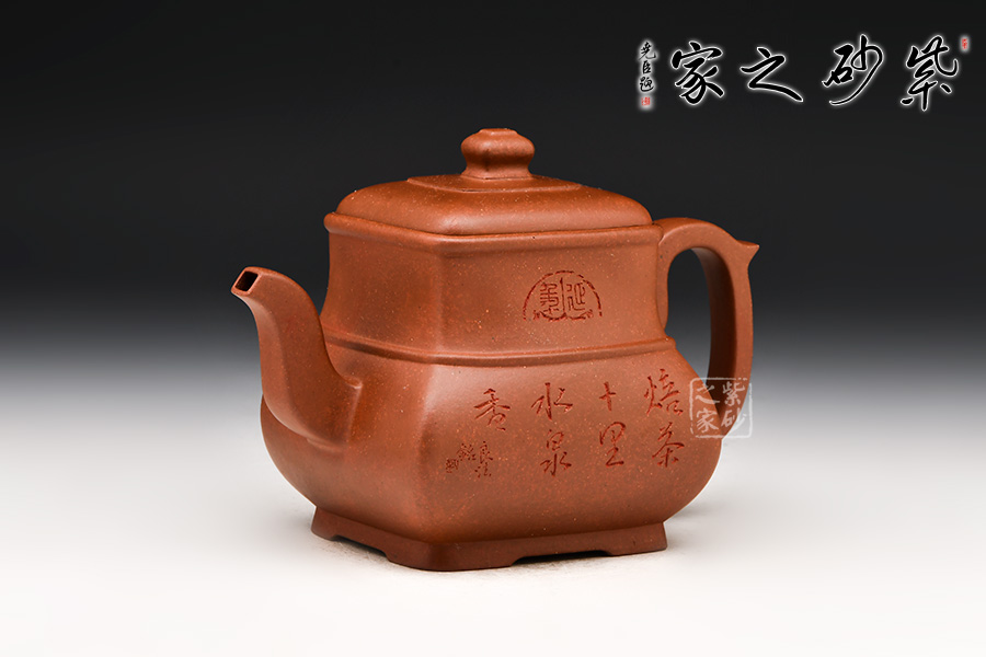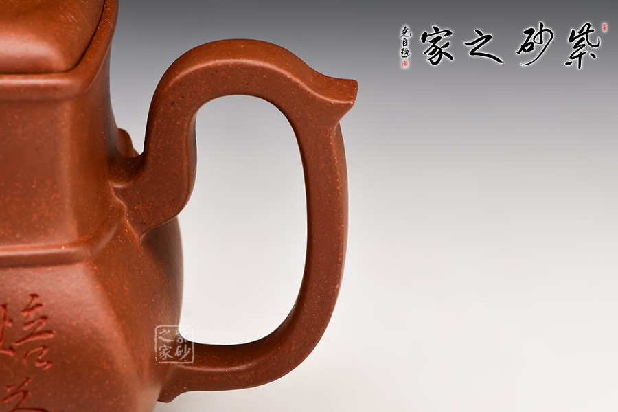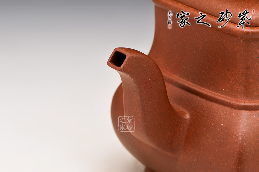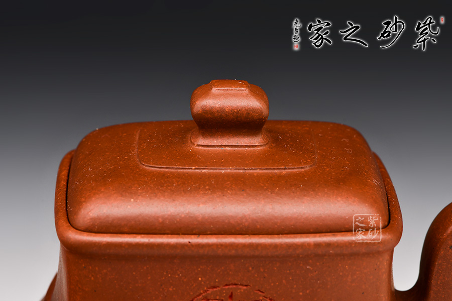 方樽壺壺身四方,上窄下寬呈梯形,中間纏一圈腰線。線角圓潤過度,藏鋒不露。流把皆四方,三彎嘴和耳型飛端把彎曲有度,仿若飄逸的彩帶,于厚重中顯出靈動(dòng)之感。四方蓋面微穹,四方扁珠鈕與壺體造型有異曲同工之妙。四方犴門加底使壺越發(fā)顯得敦厚沉穩(wěn)。