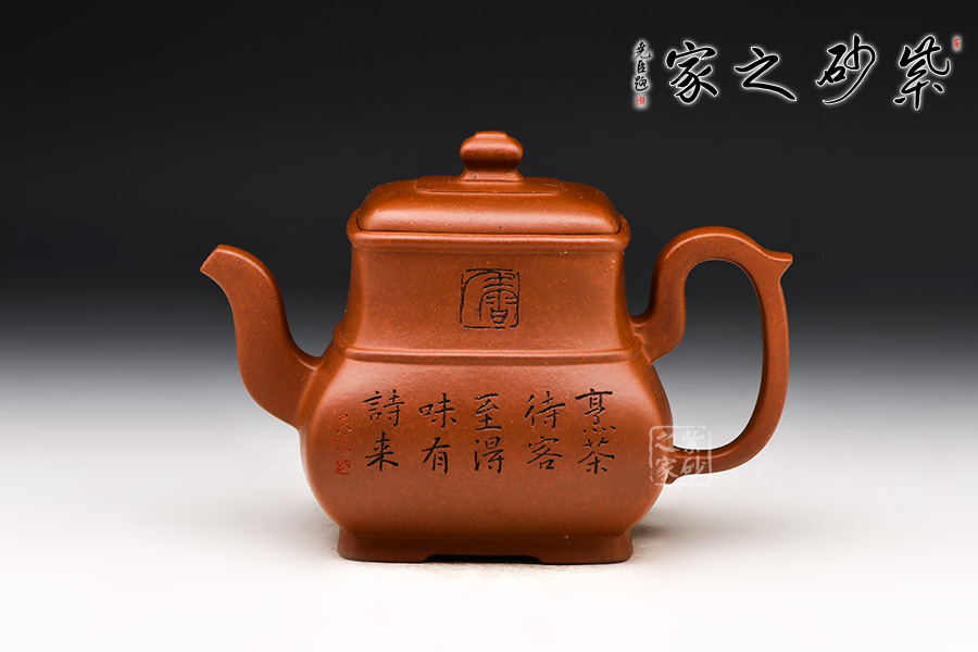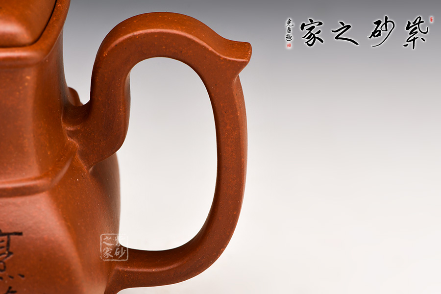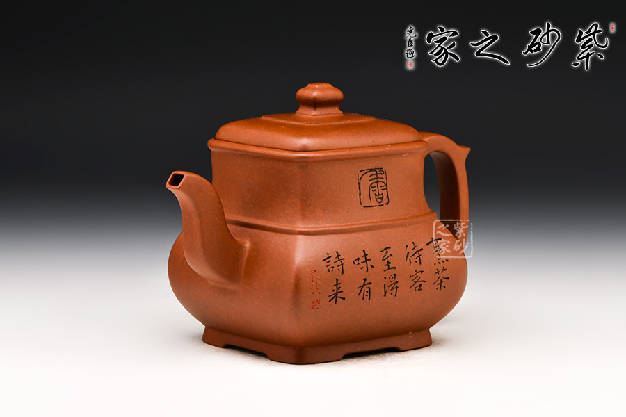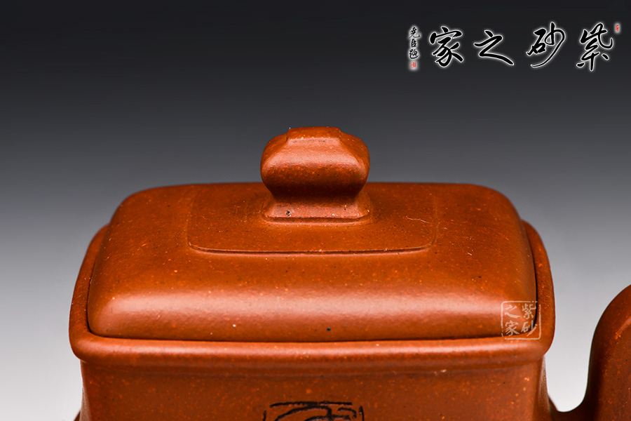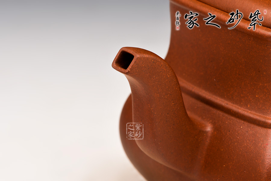 方樽壺壺身四方,上窄下寬呈梯形,中間纏一圈腰線。線角圓潤(rùn)過度,藏鋒不露。流把皆四方,三彎嘴和耳型飛端把彎曲有度,仿若飄逸的彩帶,于厚重中顯出靈動(dòng)之感。四方蓋面微穹,四方扁珠鈕與壺體造型有異曲同工之妙。四方犴門加底使壺越發(fā)顯得敦厚沉穩(wěn)。