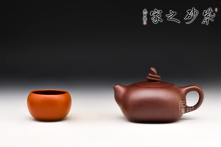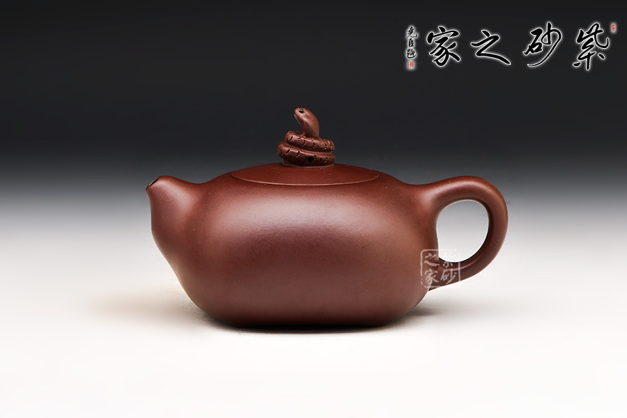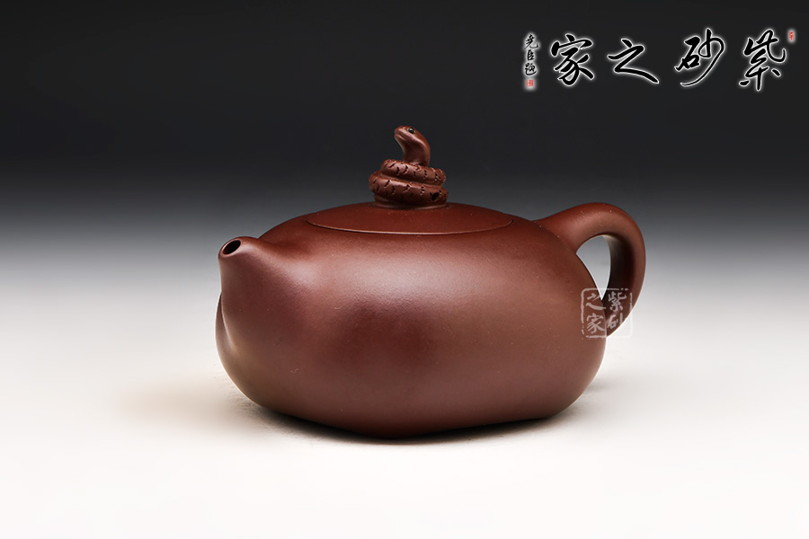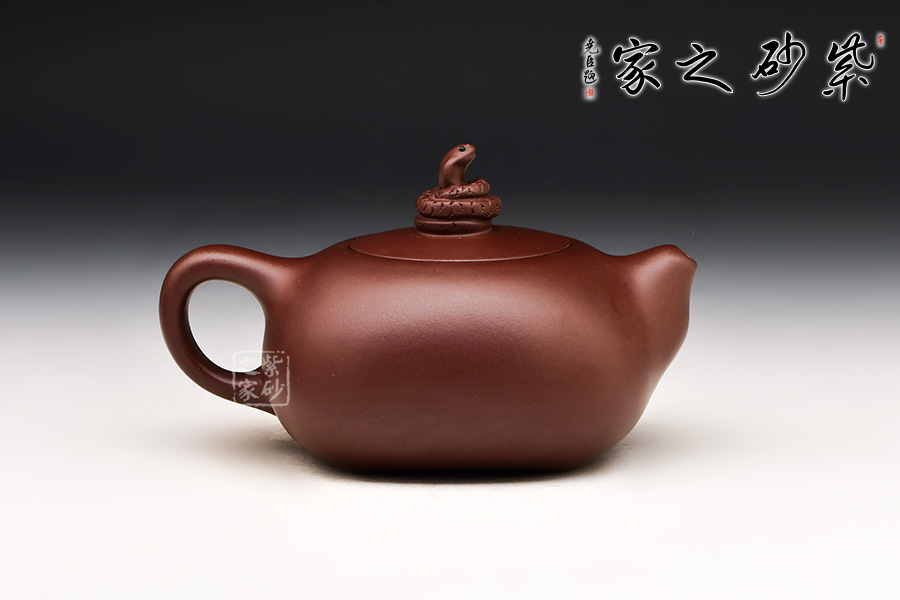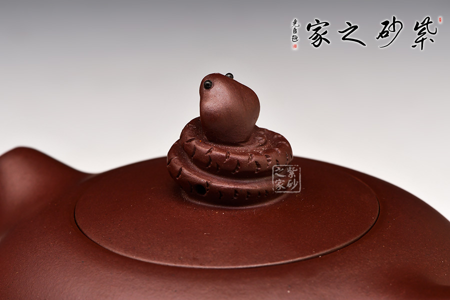 此壺壺體似若圓珠,飽滿圓弧,雍容大度,極富氣勢。壺嘴胥出壺身,短小粗大,出水流暢;環(huán)把如耳,與壺嘴搭配協(xié)調(diào)。嵌蓋,壺鈕別致盎然:以蛇為鈕,蛇身曲卷,蛇頭高昂,分外靈動逼真。