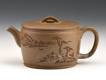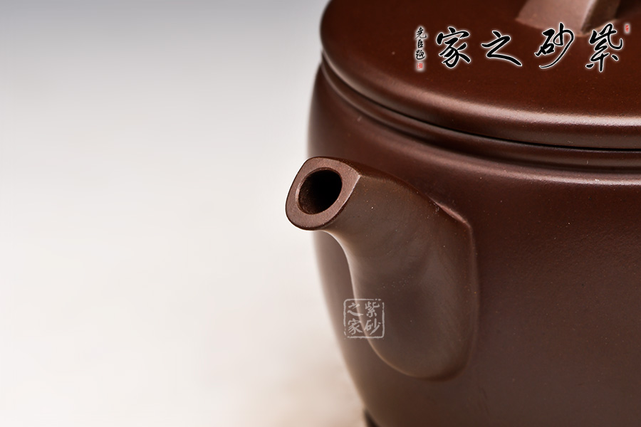 身直而口大,平蓋板子母線吻合,很是闊朗大氣。橋鈕上鏤雕裝飾,更添古韻。圈足底,彎嘴廣口,出水流暢,倒耳型把,彎曲有度。