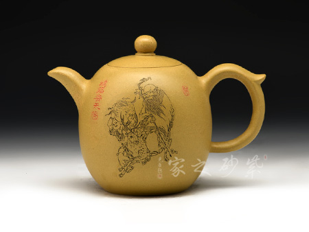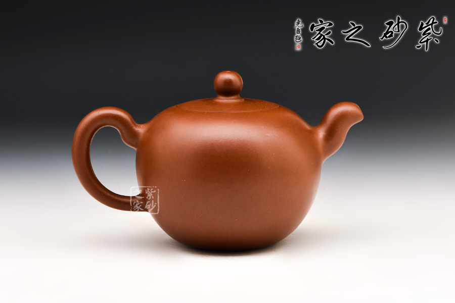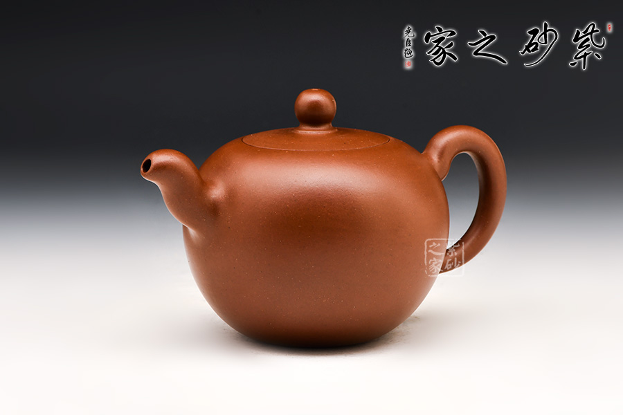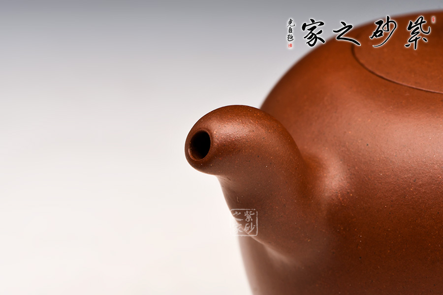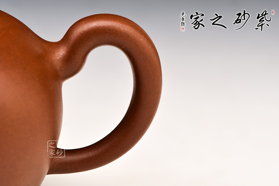 一捺底,壺體圓球形,無(wú)頸,嵌入式壺蓋,小圓珠鈕,三彎式管狀流和耳型把流線飄逸瀟灑。