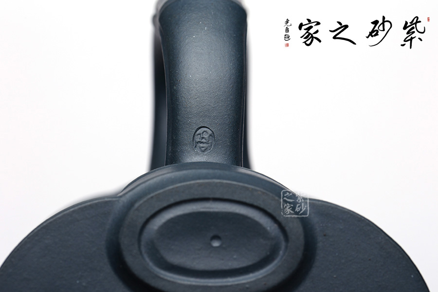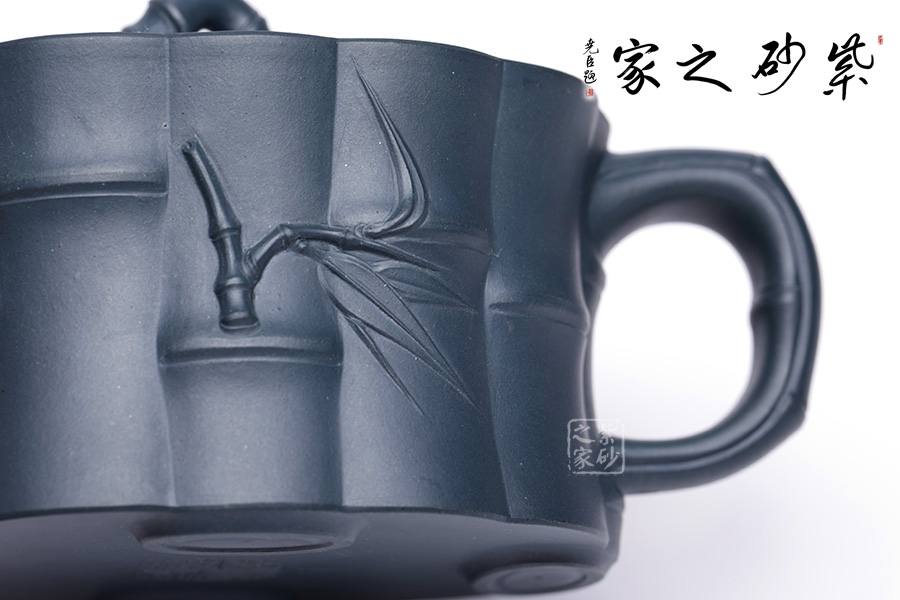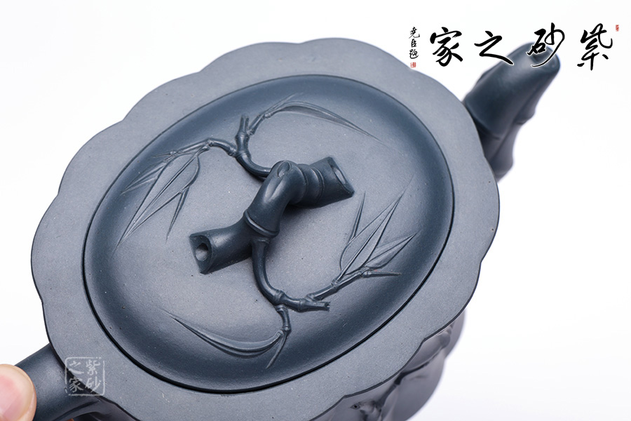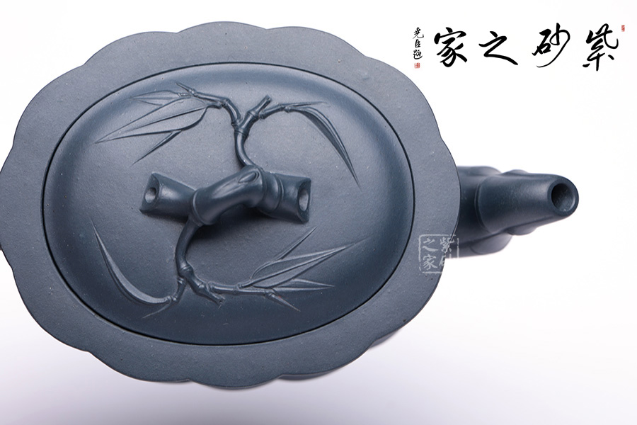 圓嵌蓋,竹節(jié)為鈕,胥出竹葉于兩側(cè)貼塑壺蓋,既對立又統(tǒng)一。