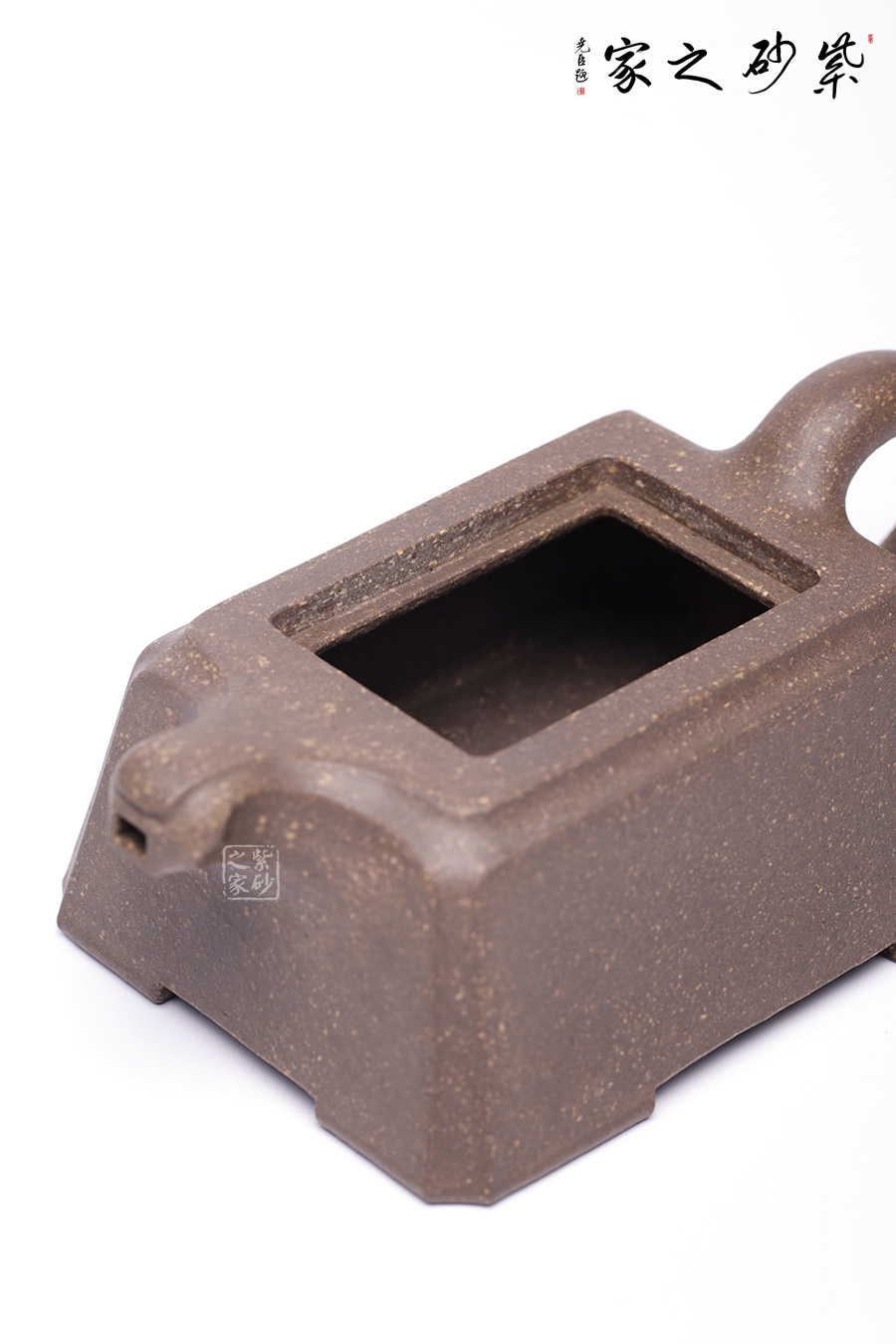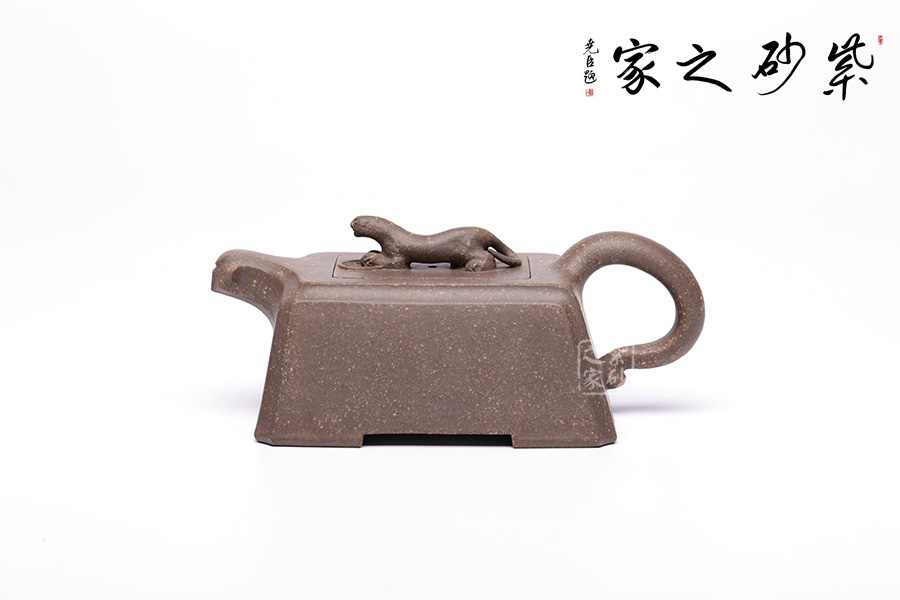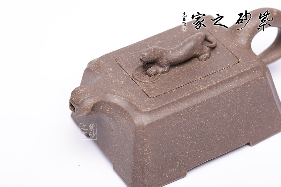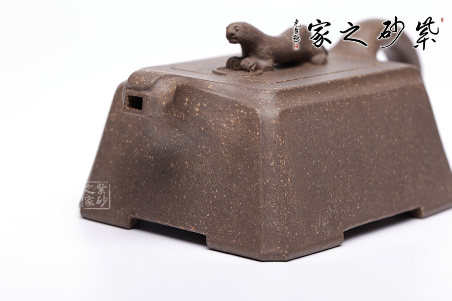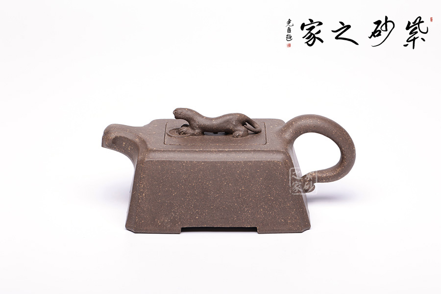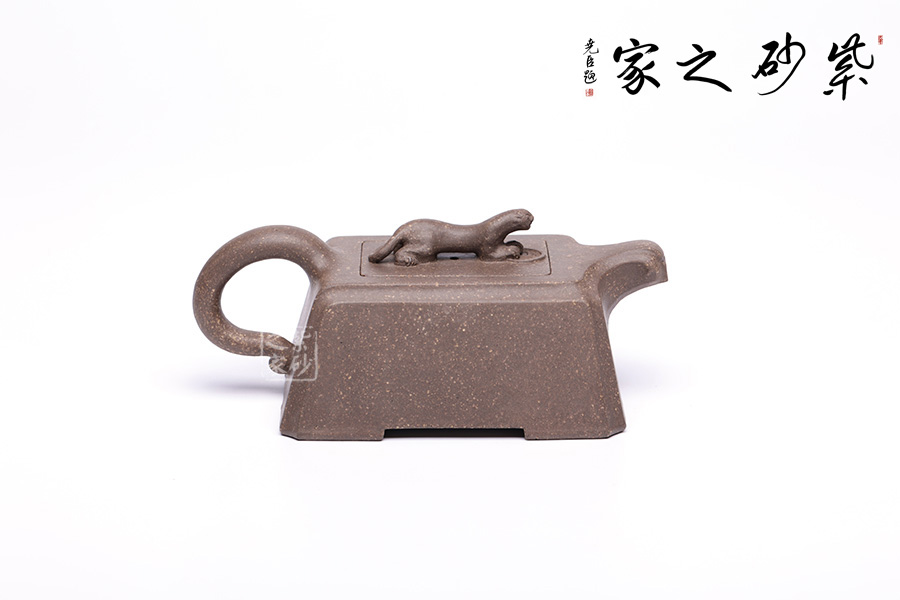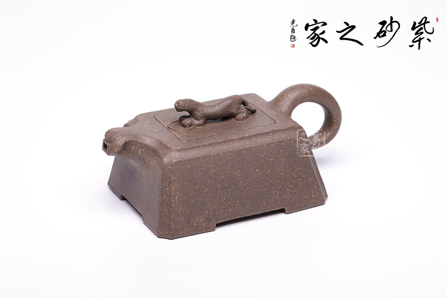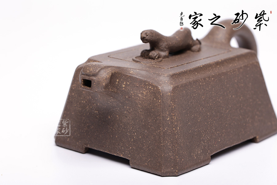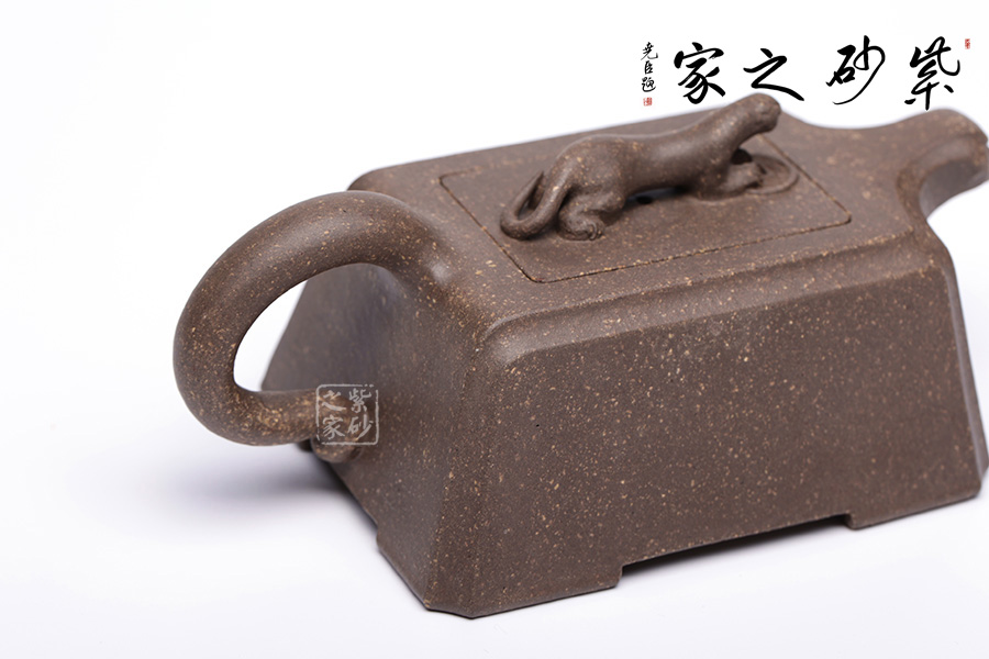 此壺以“豹”為形制,野性有力,生活動妙,昂首擺尾間氣勢不凡。壺身云梯見方,無一多余紋飾,規(guī)整大氣,短流加上不規(guī)則形態(tài)的執(zhí)耳猶如猛獸翹尾,方中不失靈動。