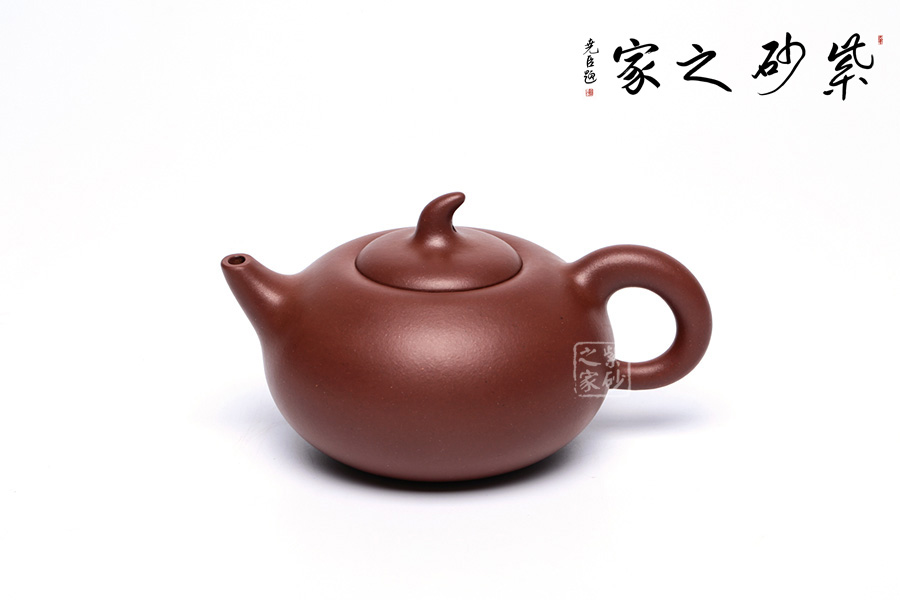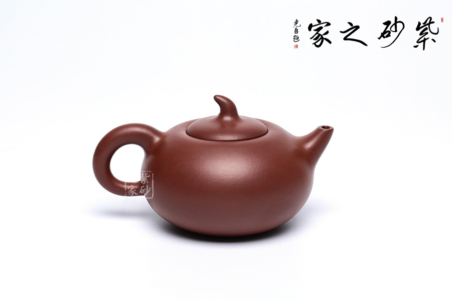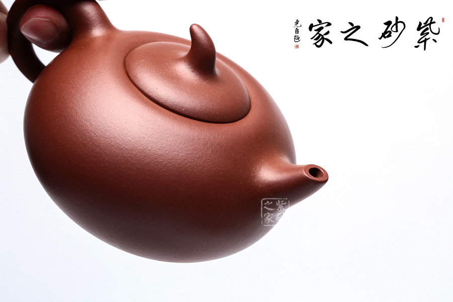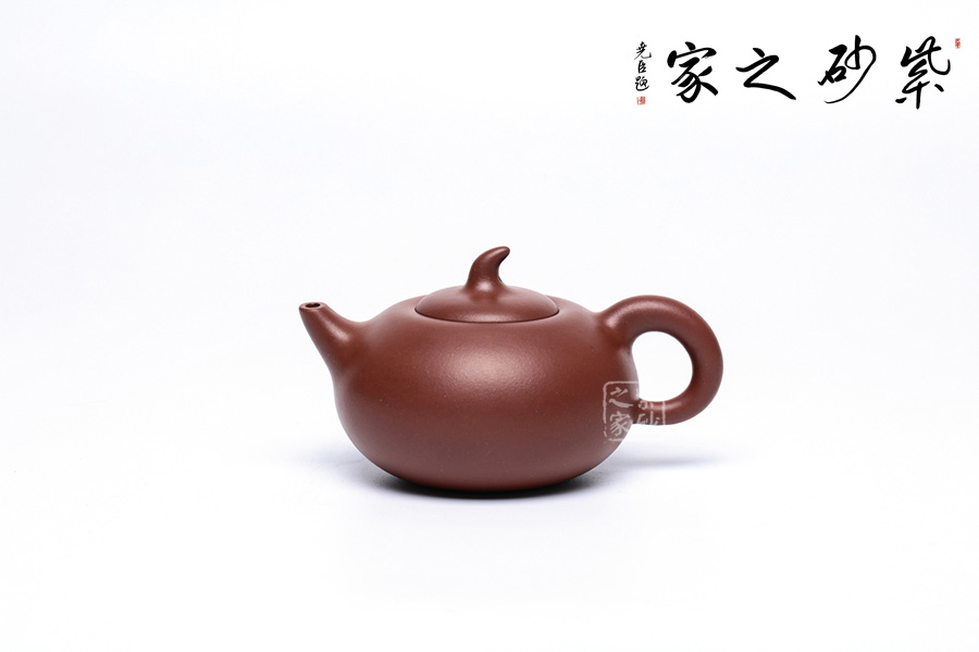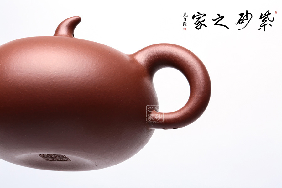 壺身圓融,線條柔和。直壺嘴向上微翹,精致小巧,出水利落,且收水時(shí)不會(huì)有剩水灑落。圓形把上大下小,端握舒適。