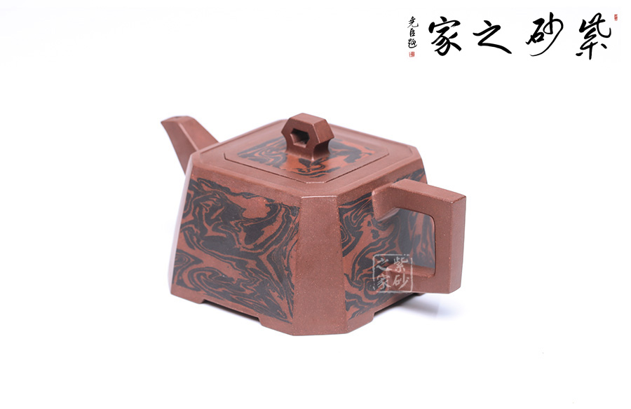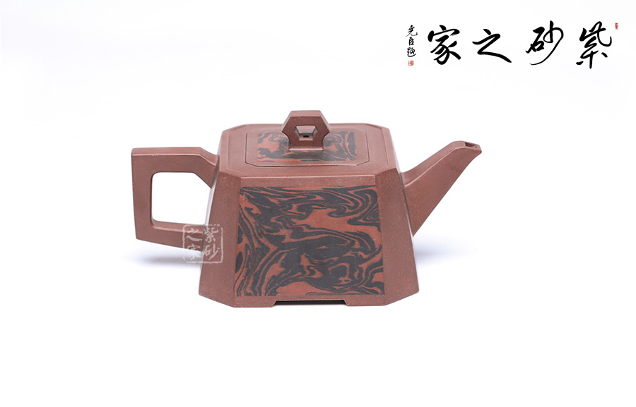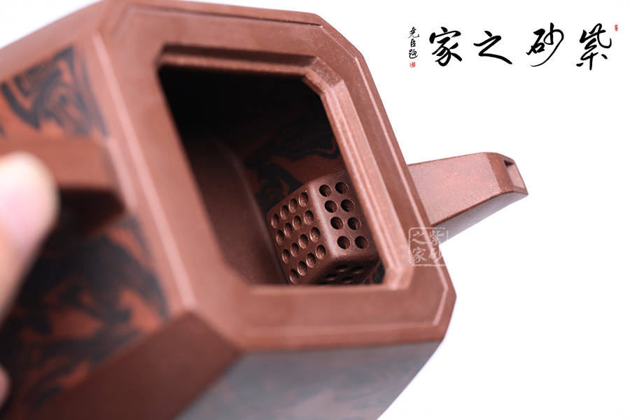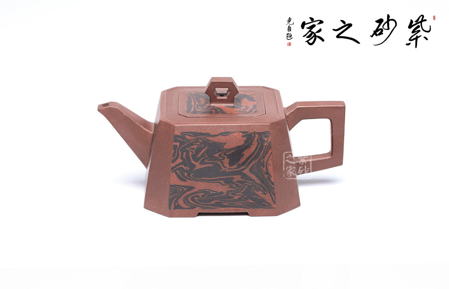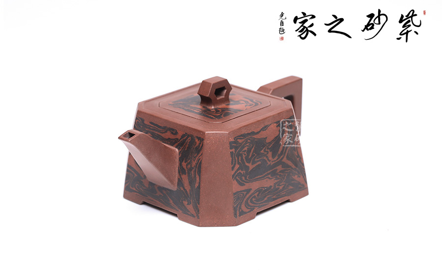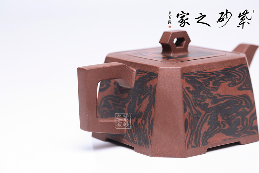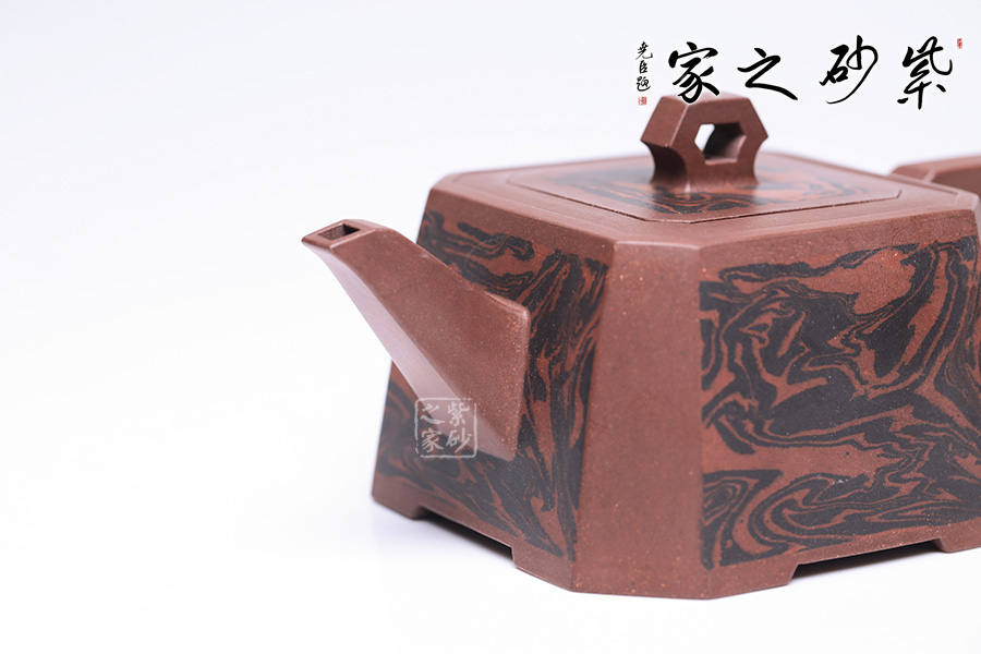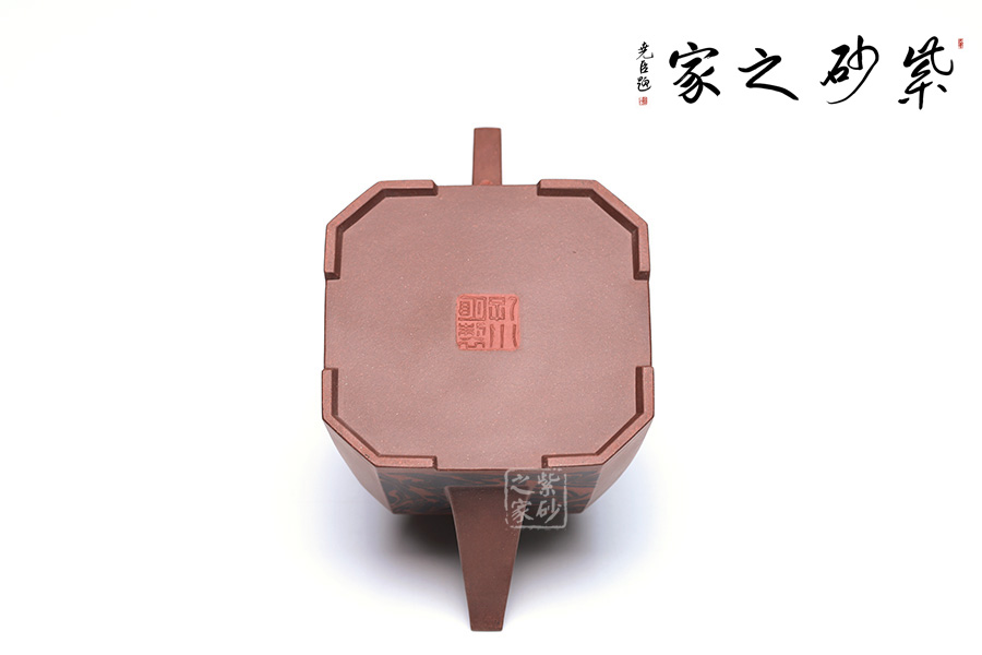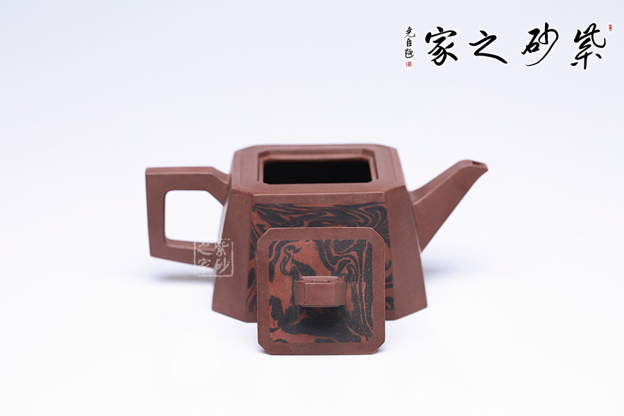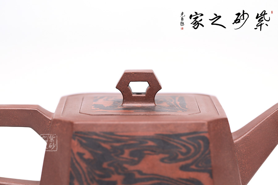 壺體四方,折角。嵌入式蓋,吻合嚴密。不規(guī)則六方形為鈕,拿捏都很方便。長直方嘴,出水利落。方形壺把,胥出自然,比例和諧,持握舒適。底部犴門成四足式,折角內(nèi)隱的壺足托起整壺,使壺凌空,打破方斗的沉重感。