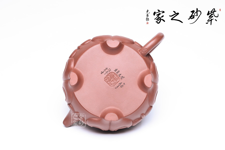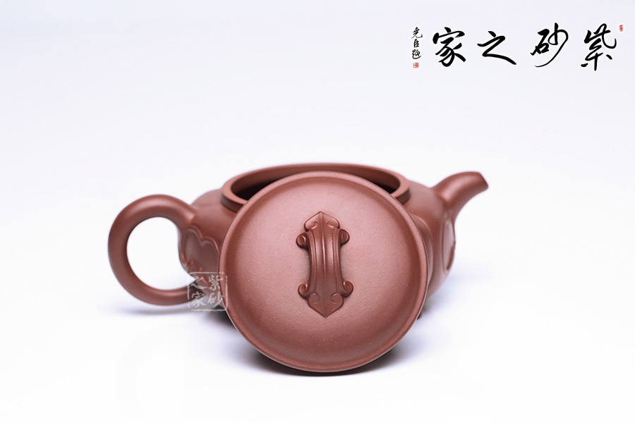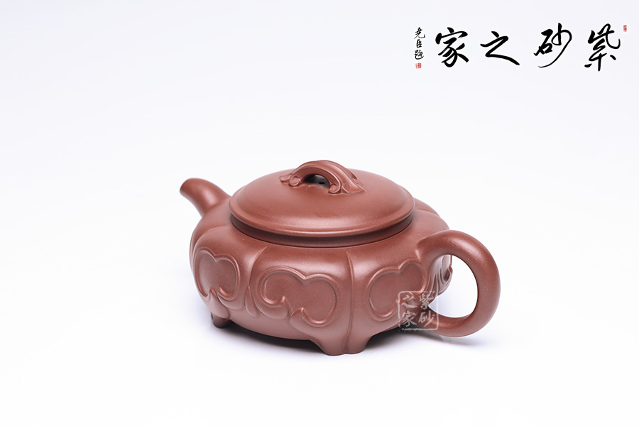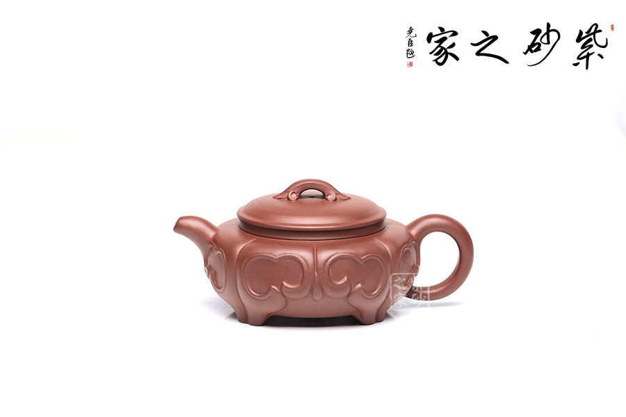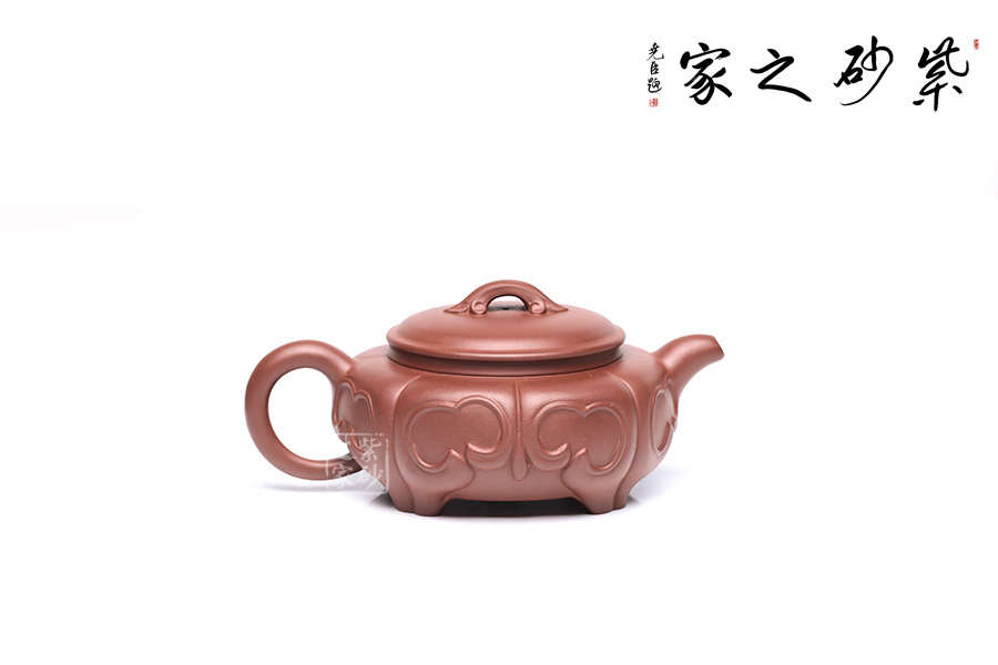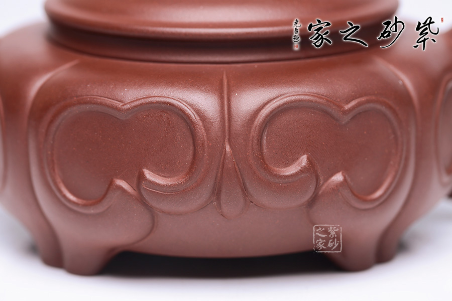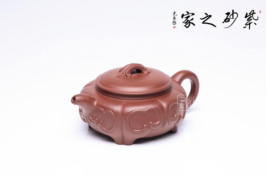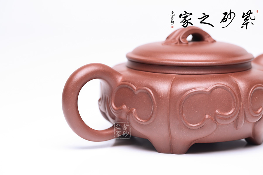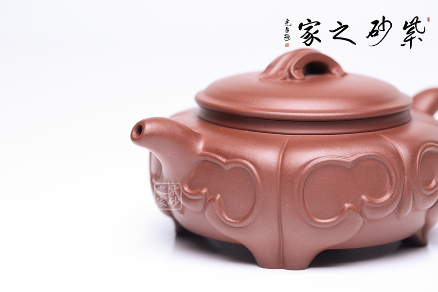 壺身略微扁圓形,在平肩的襯托下,更覺壺身扁平,端莊若大家閨秀。子母線壓蓋設(shè)計,圓線精準(zhǔn)地將半圓壺蓋和壺口分割開來。橋型鈕。如意紋飾裝點(diǎn)壺身和壺鈕,紋理清晰,形制逼真,瑞氣逼人!小巧的一彎嘴和耳型把胥出自然,相互對稱,與壺融合渾然天成。底部四足穩(wěn)穩(wěn)托起壺身,使壺凌空,顯得壺尤其矜持穩(wěn)重。