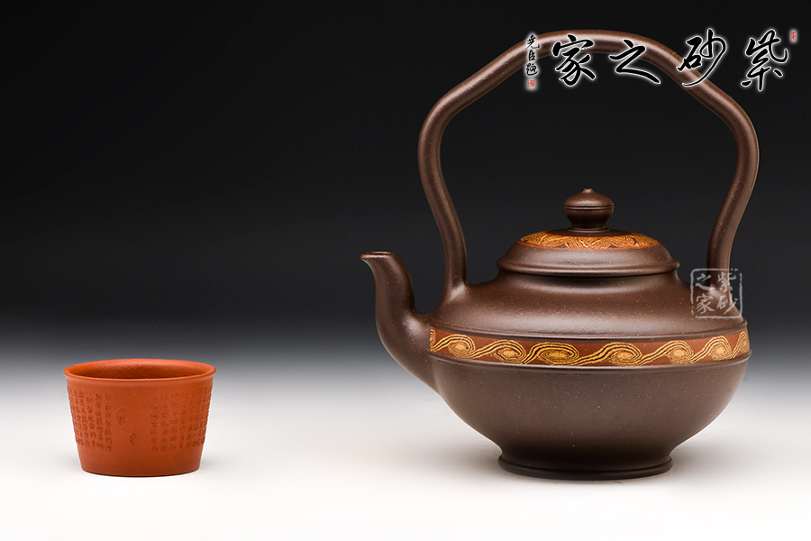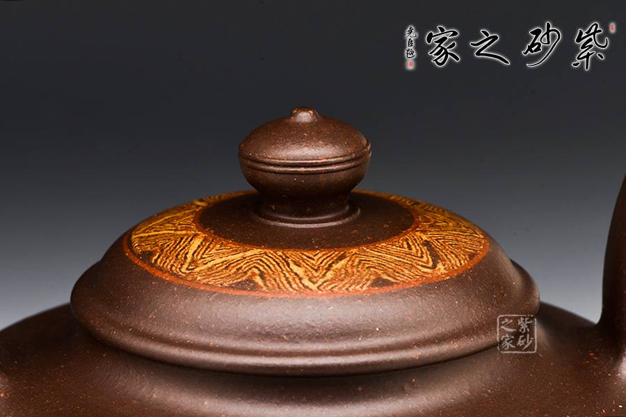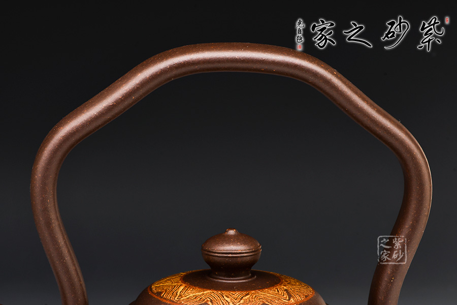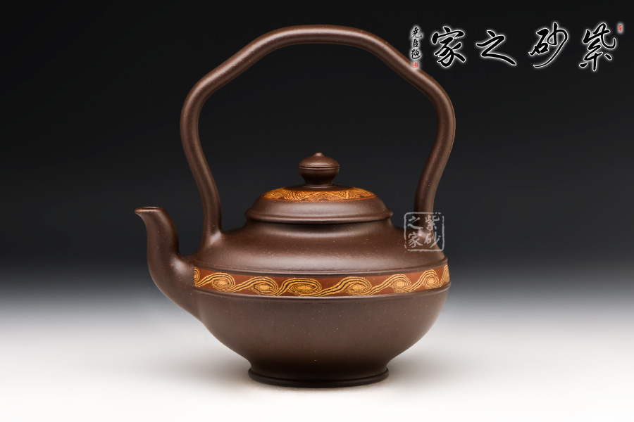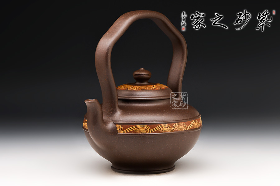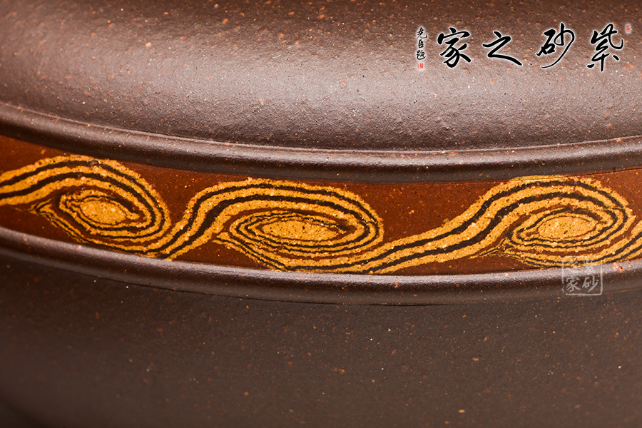 此壺既有傳承又有創(chuàng)新,紫砂絞泥裝飾技巧獨(dú)樹一幟,作品在國內(nèi)外工藝美術(shù)展評中屢獲金獎。此壺構(gòu)思巧妙,壺身圓潤,胎質(zhì)細(xì)膩,觸手溫潤,壺身上層層線條,婉轉(zhuǎn)流暢,猶如碧波蕩漾。金線勾勒出祥云蓋頂,以極其細(xì)膩的筆觸,勾勒水云間的靈活秀美,讓人賞心悅目。