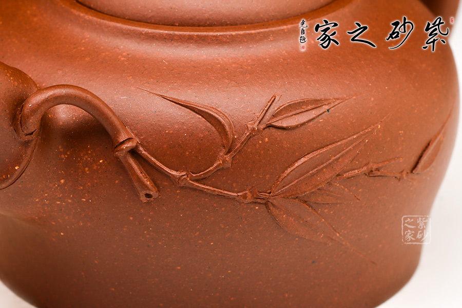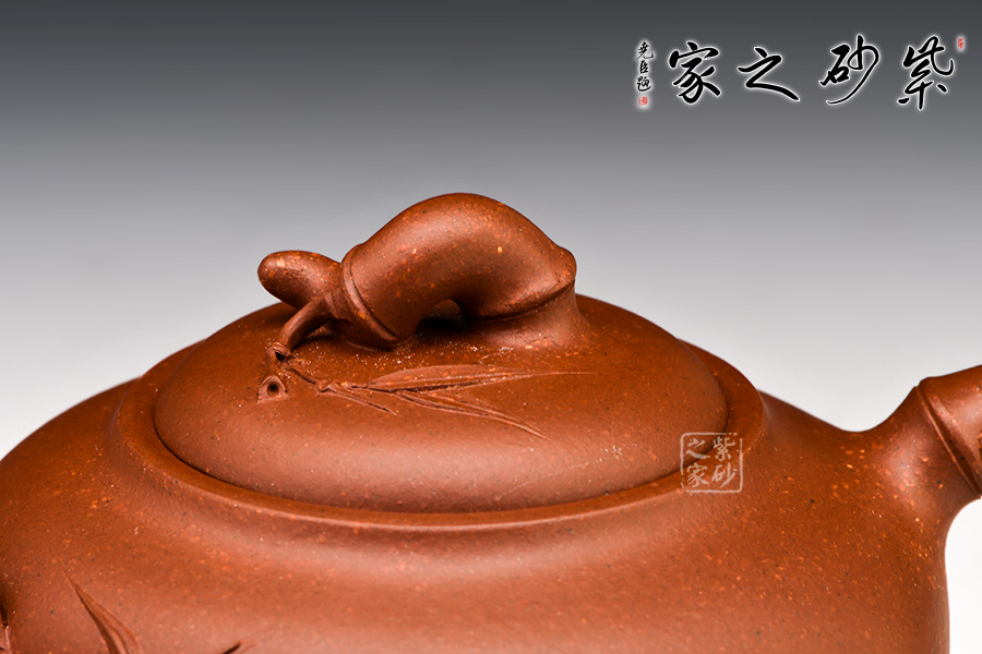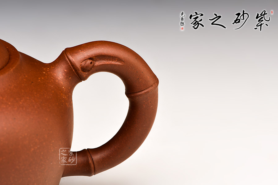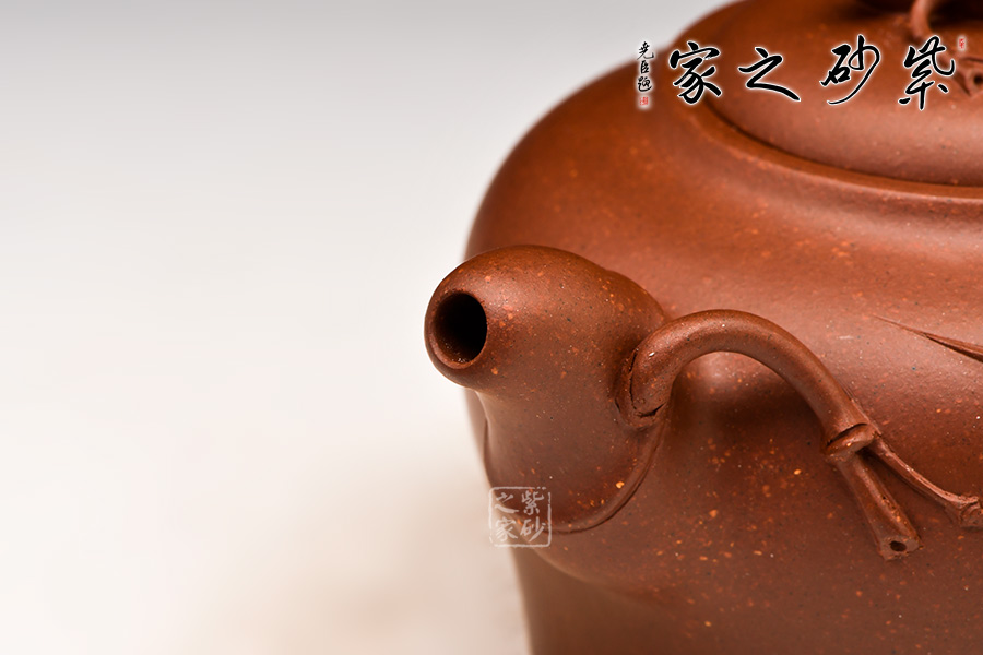 范忠君,宜興丁蜀鎮(zhèn)陶藝世家。此款作品精選原礦底槽青制成,器型圓中見方,方中寓圓,竹節(jié)盤于圓形壺蓋上,整體動感通亮,厚而不重。胎身圓、氣勢穩(wěn)、布局均,胸部飽滿,溫文爾雅。