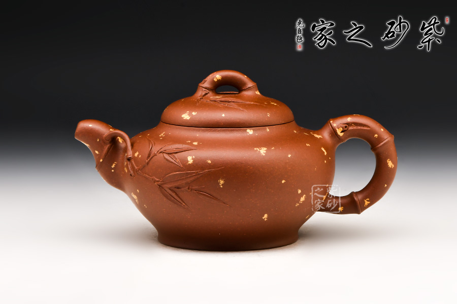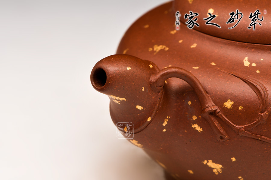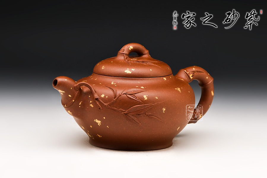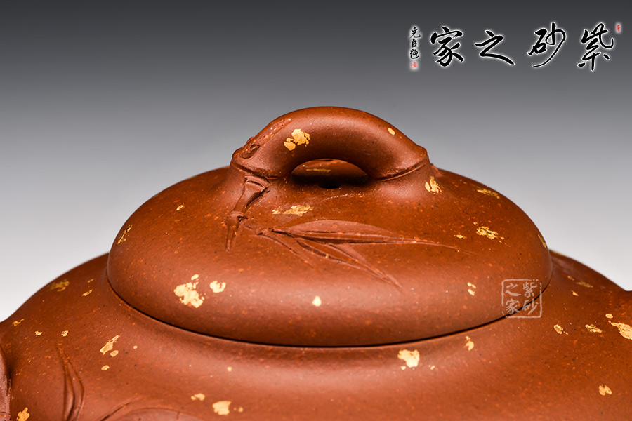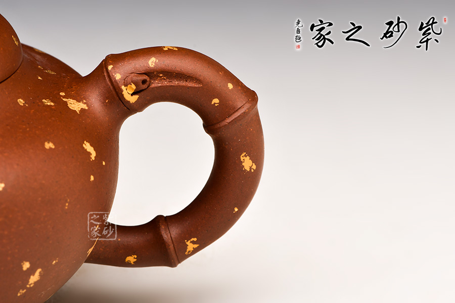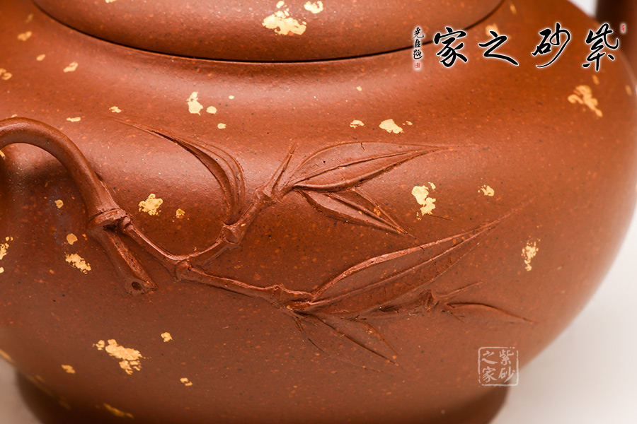 范忠君,宜興丁蜀鎮(zhèn)陶藝世家。此壺泥料精選原礦底槽青,以竹為題制成茗壺,壺體、壺蓋、星金璀璨點(diǎn)綴幾片竹葉,形式自然大方,清靈飄逸、布局一體,觸覺舒適,把玩實(shí)用。壺體穩(wěn)重,寬和大度,身懷雅量,能納萬千事。頗具收藏價(jià)值。