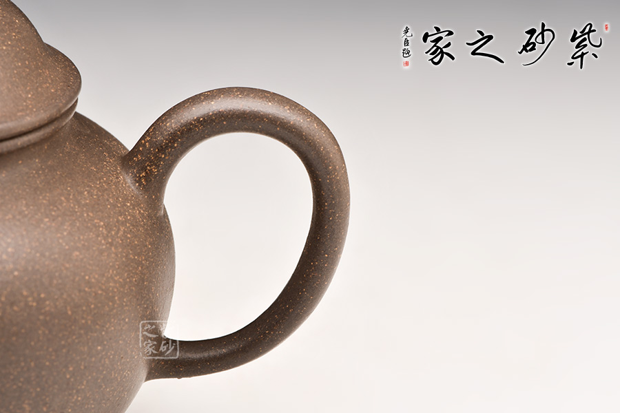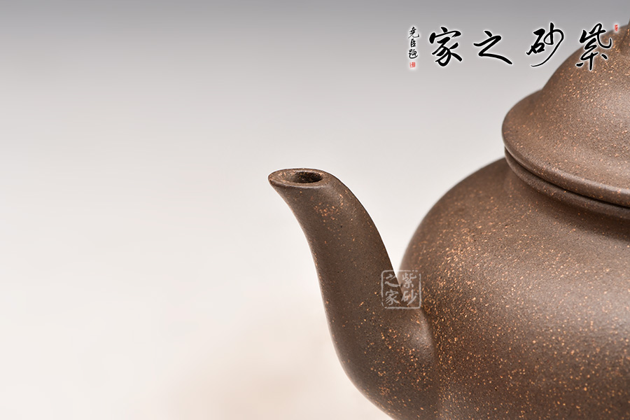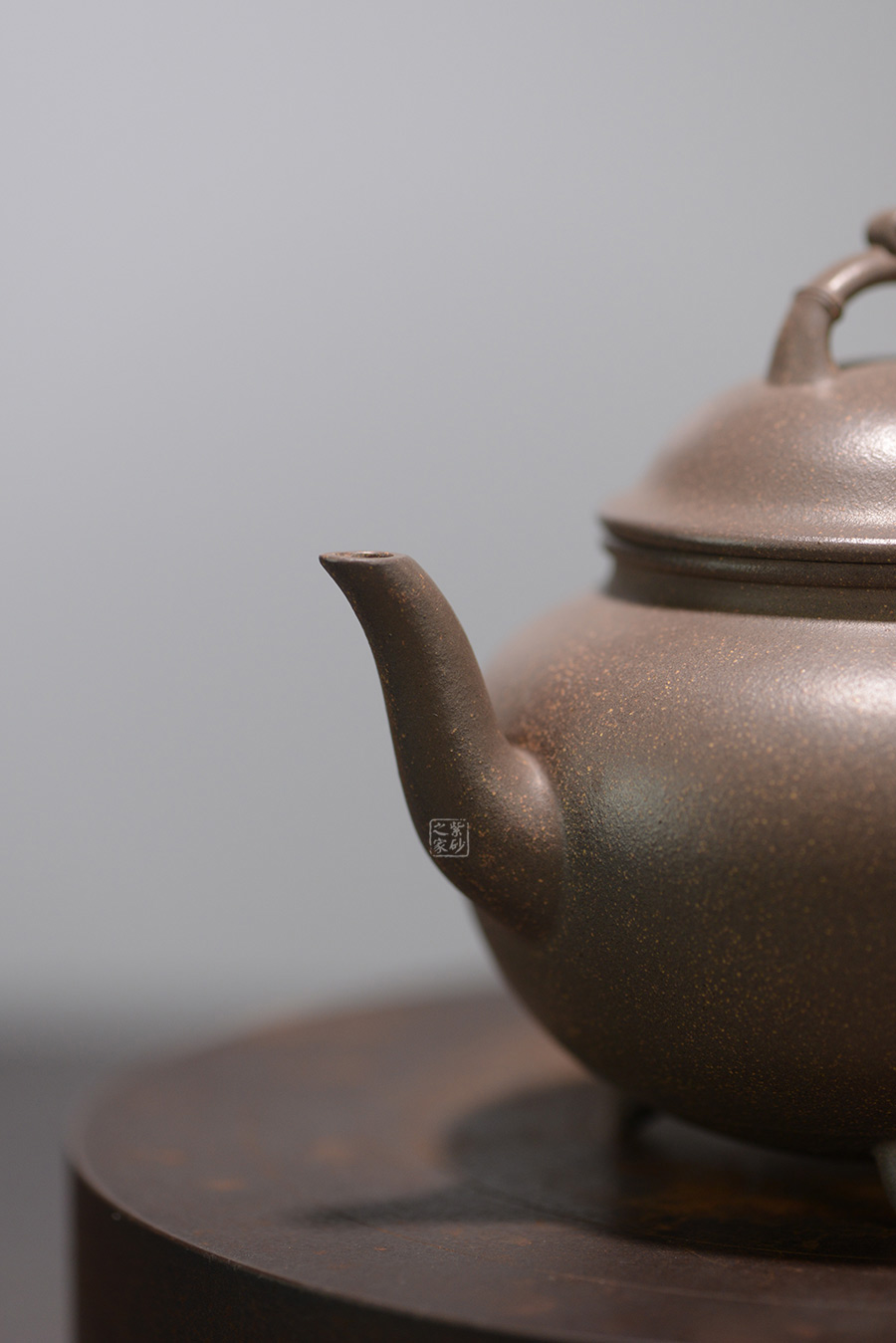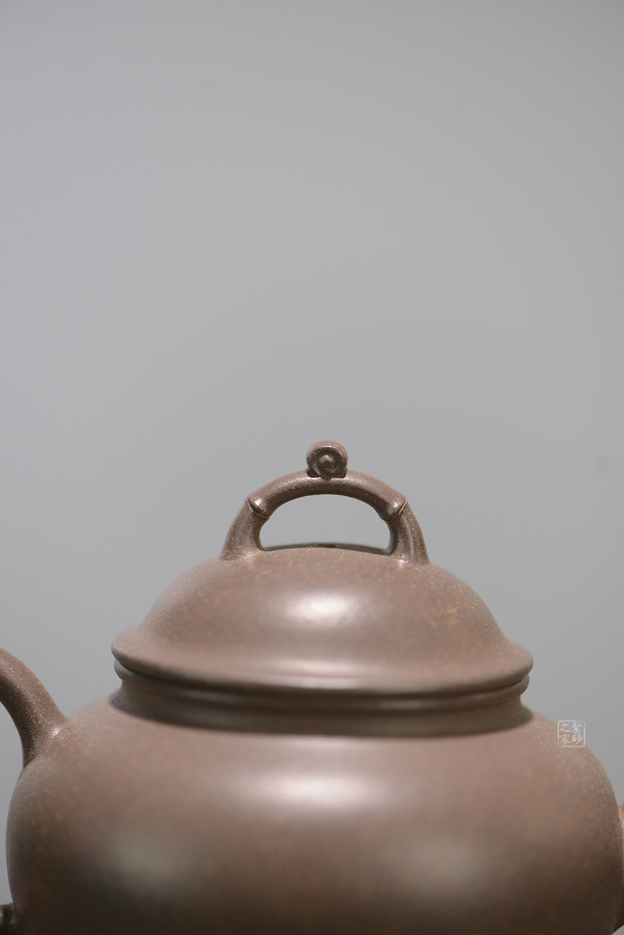 范忠君,宜興丁蜀鎮(zhèn)陶藝世家。此壺整體造型古樸大方,神形兼?zhèn)?/span>,泥料為青段;壺嘴順暢自然,出水爽快;壺把粗細(xì)適中,與壺身銜接自然,拿捏舒適。極具觀賞價(jià)值,宜收藏、把玩。