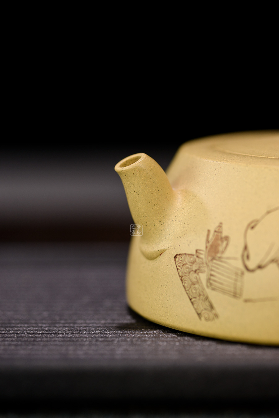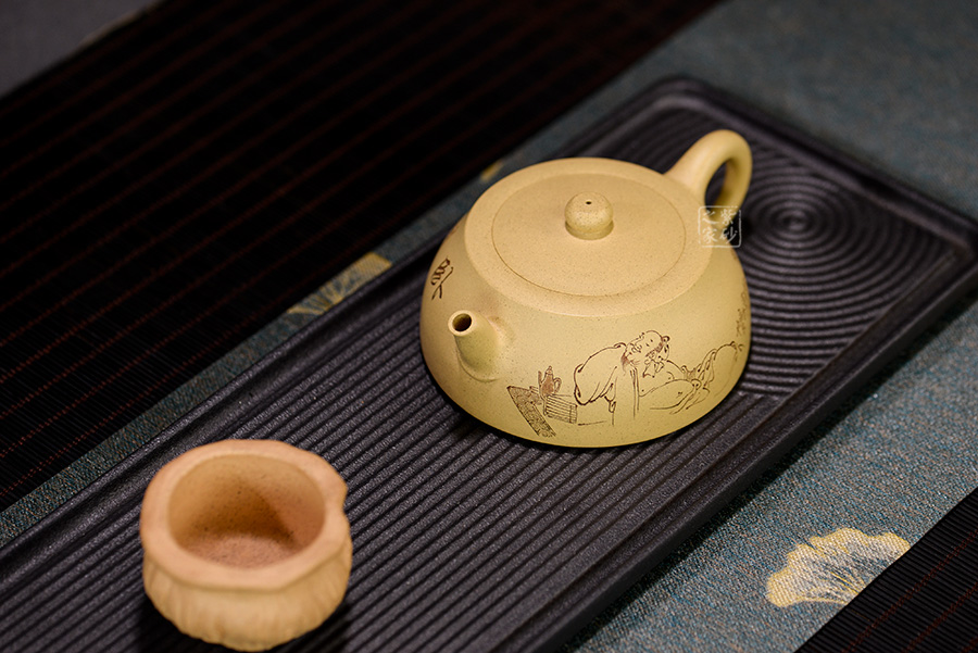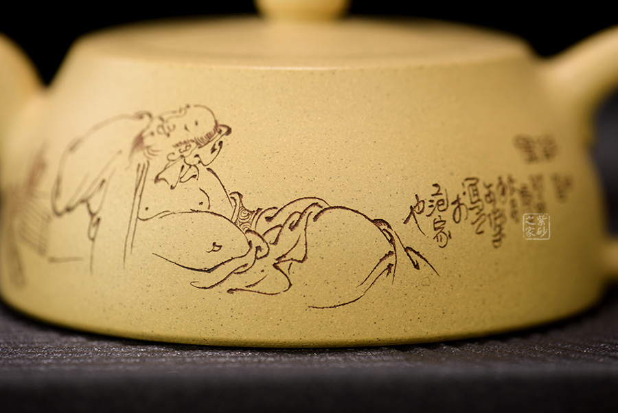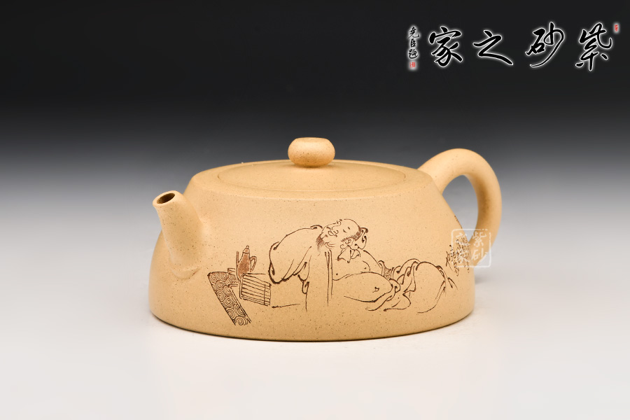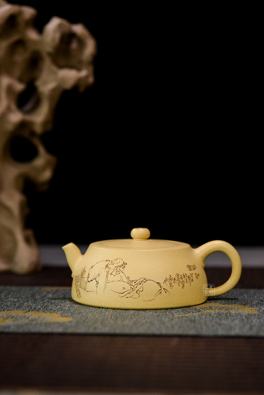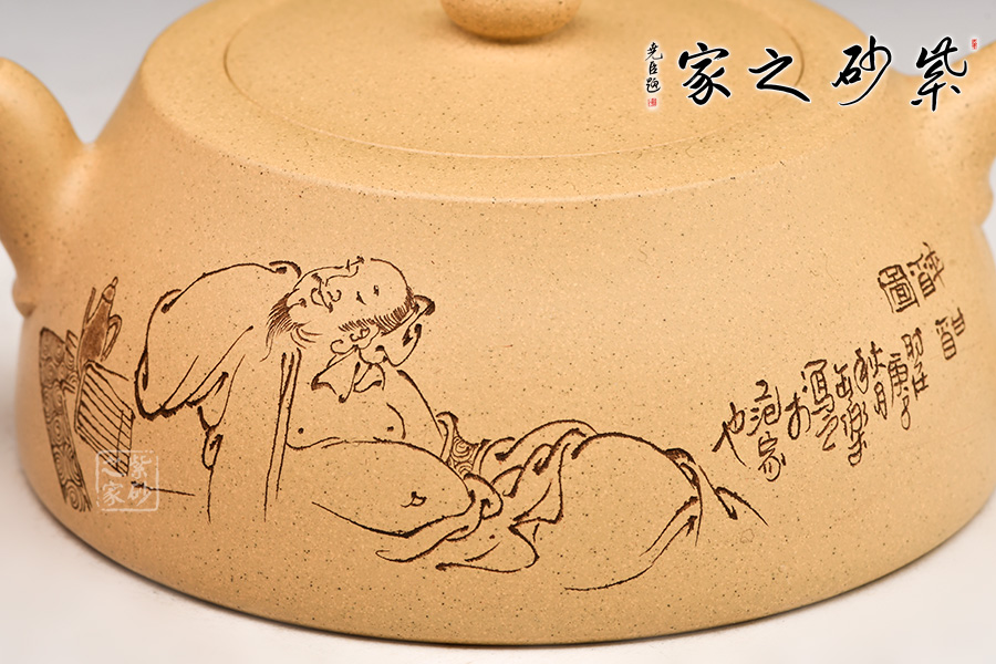 范小君,藝名“缶樂”。師承中國工藝美術(shù)大師毛國強,傳承刀筆藝術(shù),刻繪特色鮮明,作品大致以線條見長,俊逸清秀。此壺精選本山綠泥作泥料,壺口出水利落流;壺面刻繪工藝精巧,正面刻繪醉酒老翁,栩栩如生,生動形象,反面刻字《暢臥月眠云》,刻繪功底深厚。