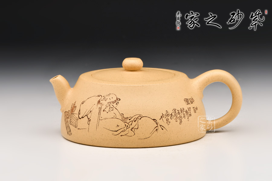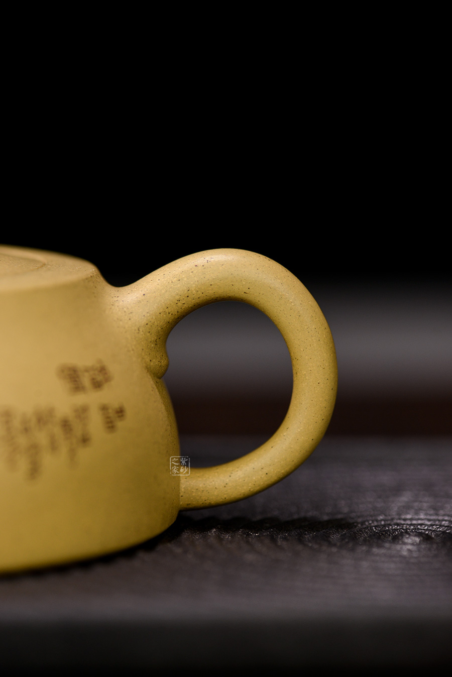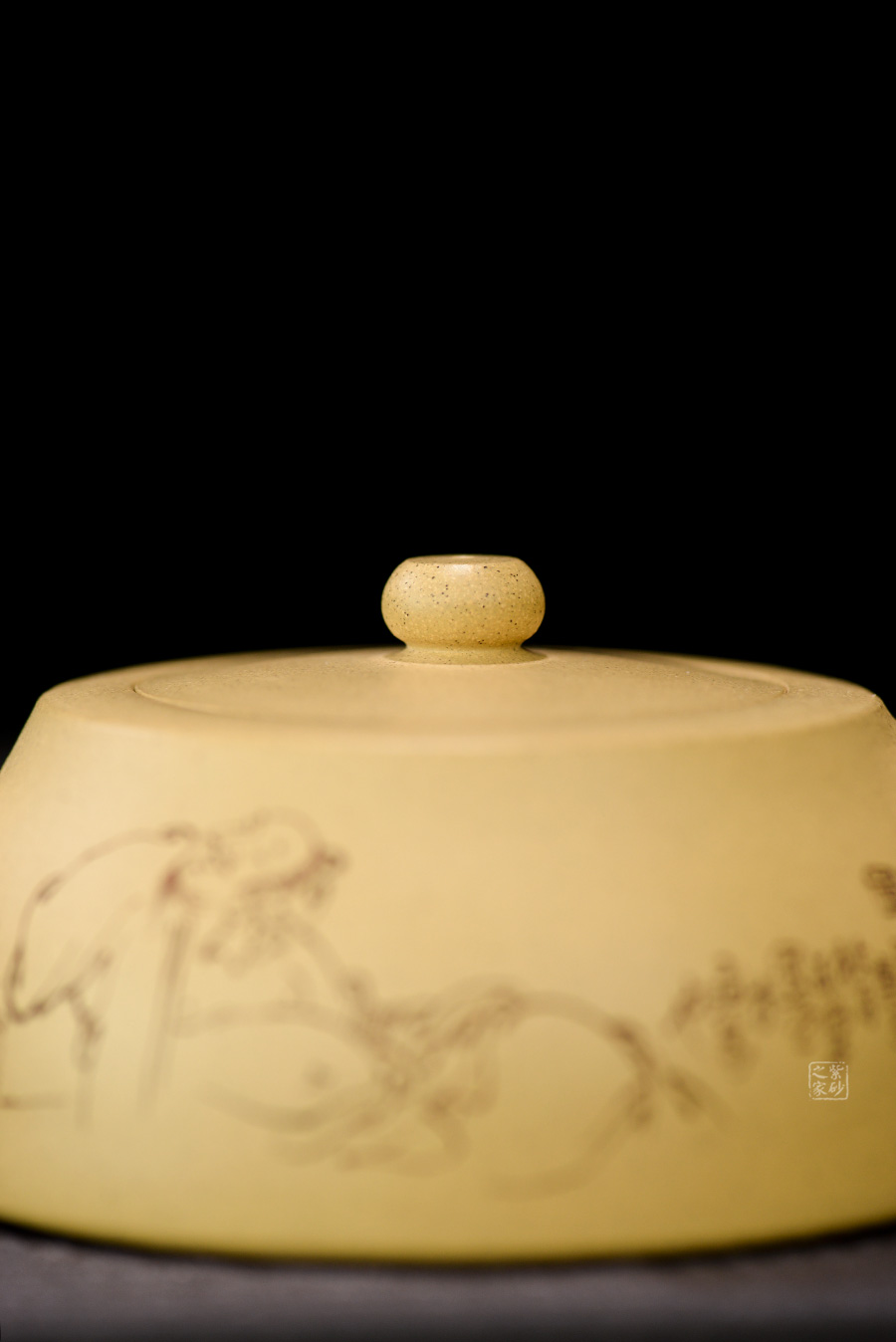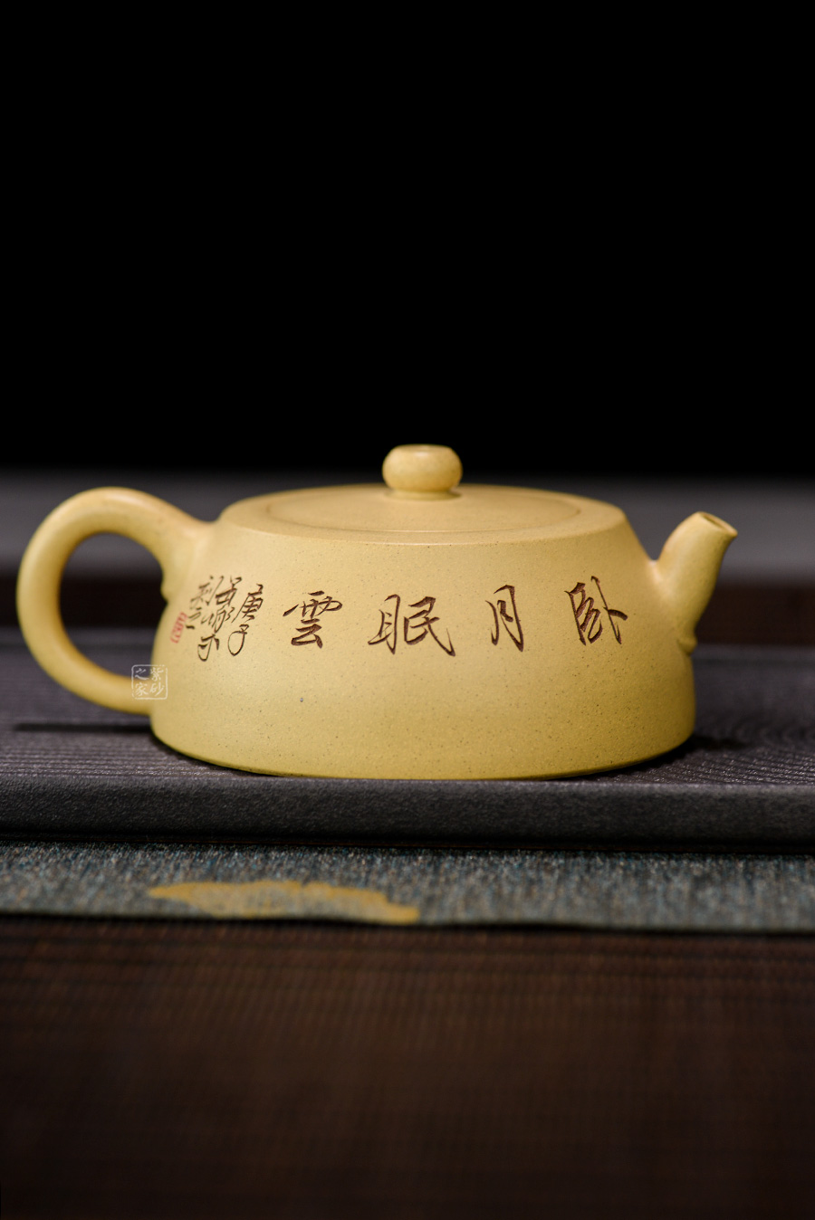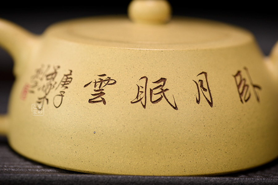 范小君,藝名“缶樂”。師承中國工藝美術(shù)大師毛國強,傳承刀筆藝術(shù),刻繪特色鮮明,作品大致以線條見長,俊逸清秀。此壺精選本山綠泥作泥料,壺口出水利落流;壺面刻繪工藝精巧,正面刻繪醉酒老翁,栩栩如生,生動形象,反面刻字《暢臥月眠云》,刻繪功底深厚。