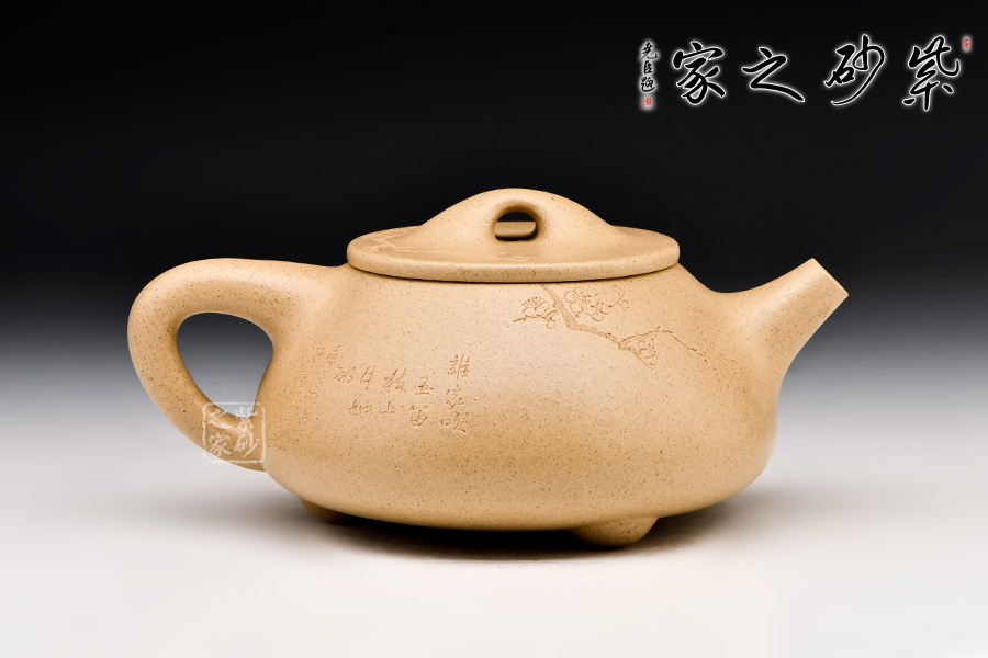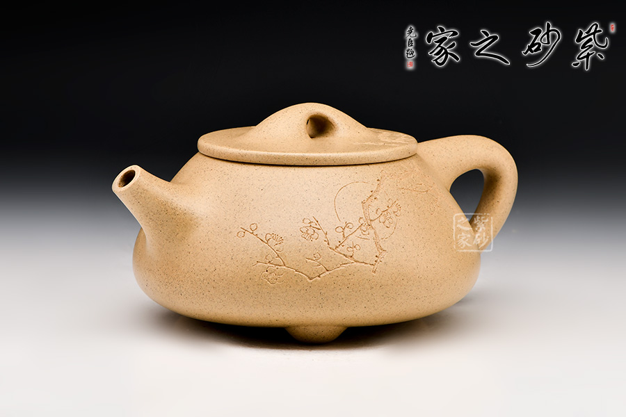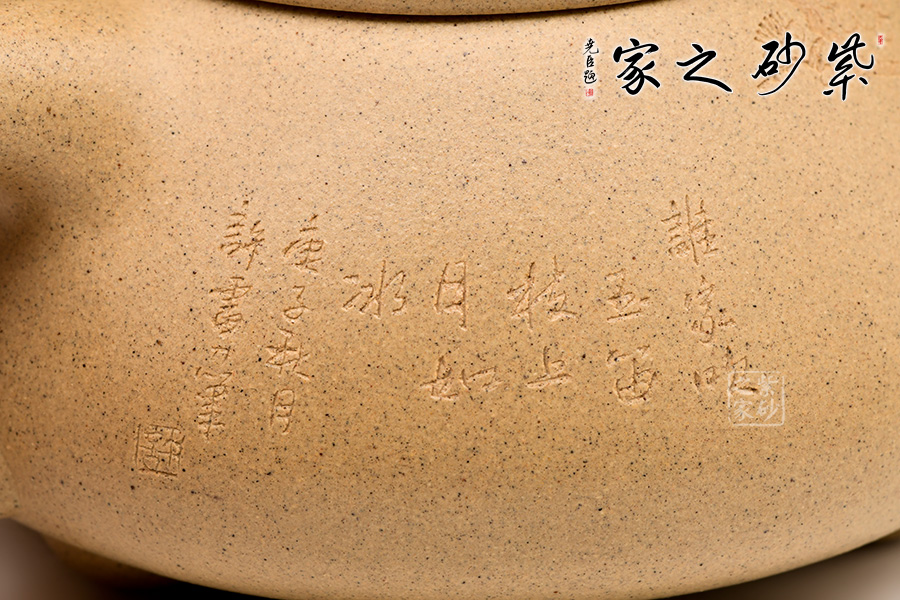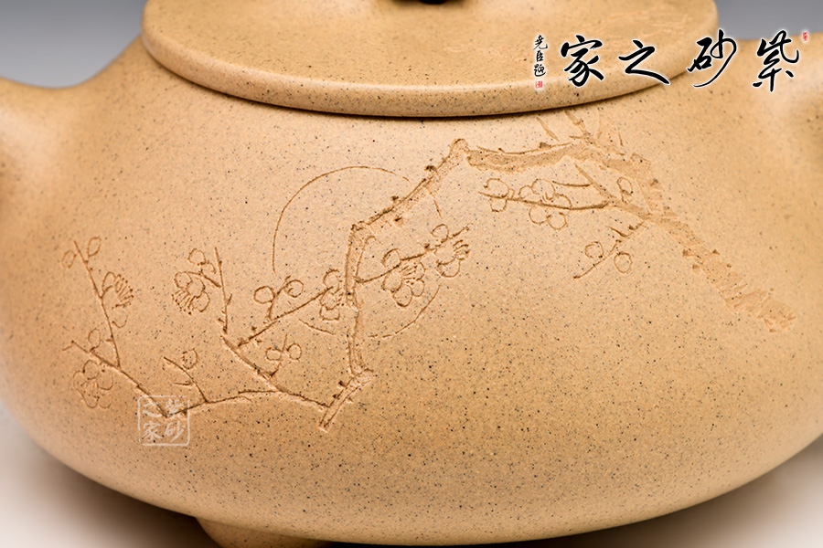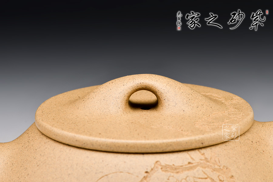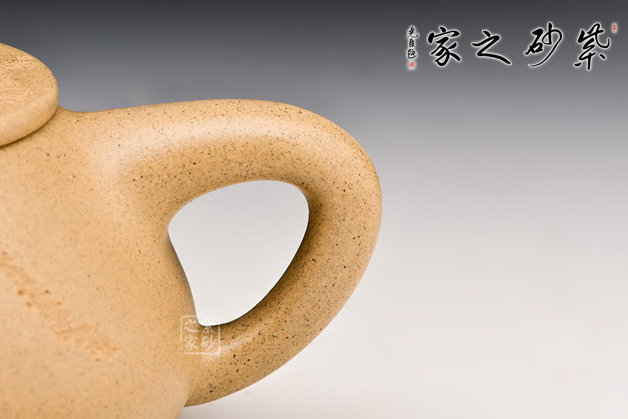 周健,出生于陶都宜興,畢業(yè)于南京師范大學(xué)藝術(shù)設(shè)計專業(yè)。從研究員級高級工藝美術(shù)師董亞芳,其后隨師公何道洪學(xué)藝;作品題材廣泛,藝術(shù)格調(diào)高雅,壺感渾然一體,獲業(yè)內(nèi)人士的一致好評。此壺精選本山綠作泥料,色澤呈現(xiàn)黃色調(diào),質(zhì)感細(xì)膩,壺身曲線柔和流暢,整體看呈“人”字形直線的運用,主視角以內(nèi)為梯形表面,整體架構(gòu)也可視為典型的三角狀石瓢,極為穩(wěn)重。