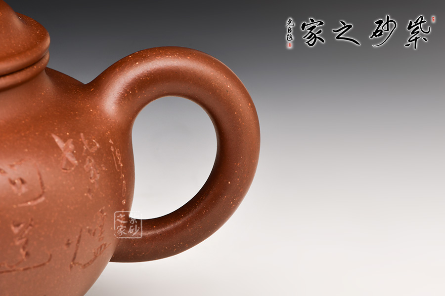 儲(chǔ)蓁,師從其父研究員級(jí)高級(jí)工藝美術(shù)師儲(chǔ)集泉,其作品形式厚重,裝飾有趣,頗有其父作品之風(fēng)范,很受收藏界看好。此壺精選原礦底槽青泥料制成,一彎流嘴胥出,柔美之姿明顯,壺柄圈大,略上挺,形成一圈圓潤(rùn)飽滿的弧線,樸雅大方,加底設(shè)計(jì)將壺身襯托得亭亭玉立。