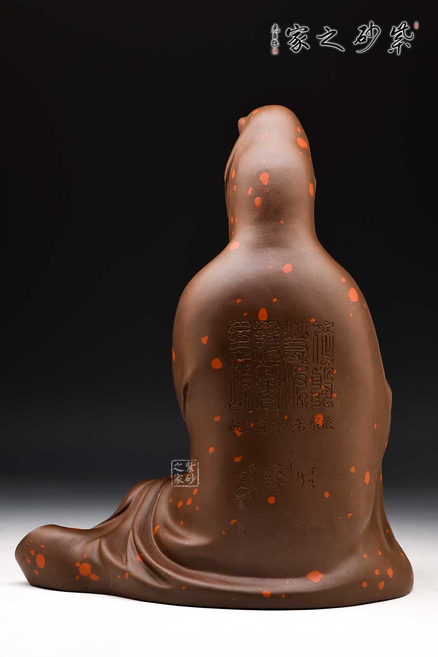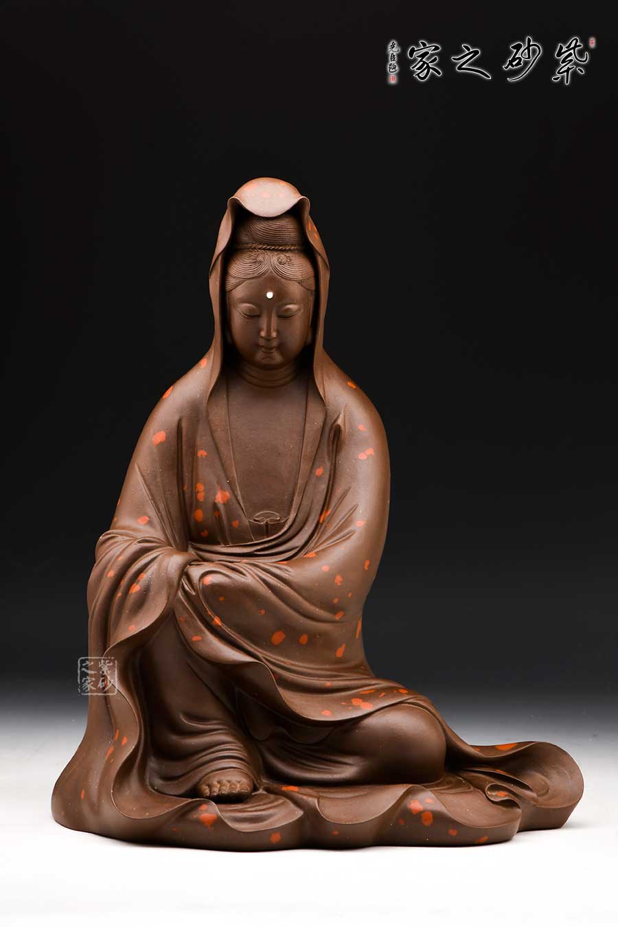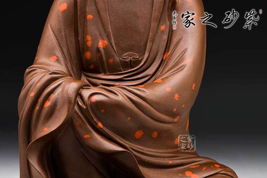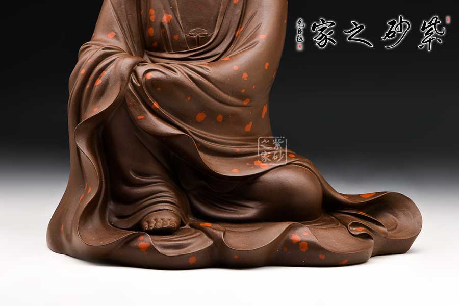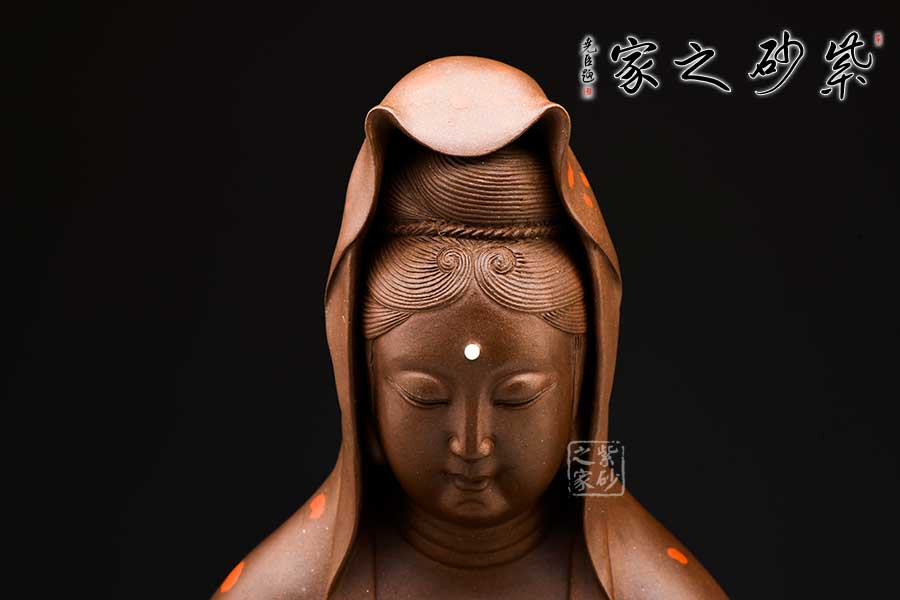 觀音大士端莊而坐,頭戴佛陀發(fā)冠,柳眉細(xì)眼,頷首下視,直鼻小口,華美精巧,寬肩束腰,體態(tài)均稱,造型優(yōu)美。整件紫砂雕塑作品,人物神態(tài)逼真,靜中有動,栩栩如生。