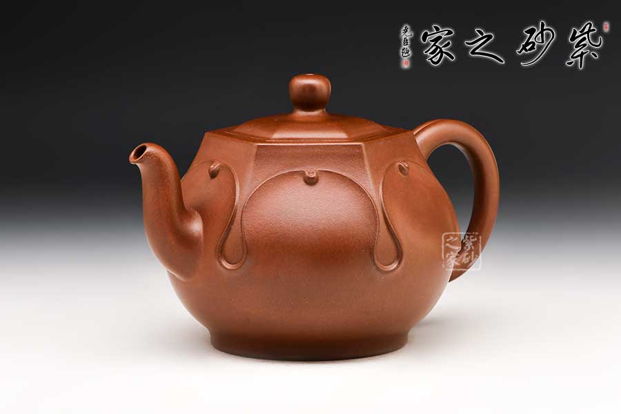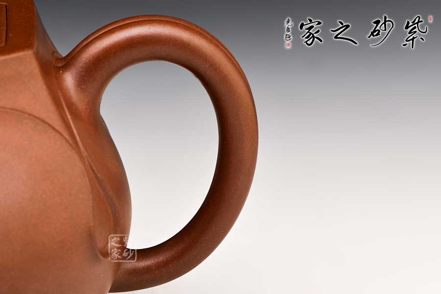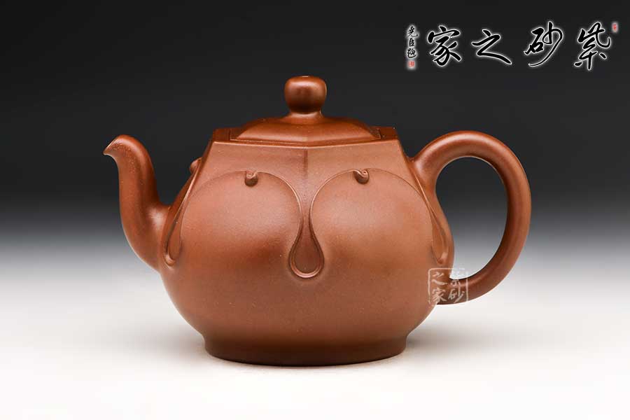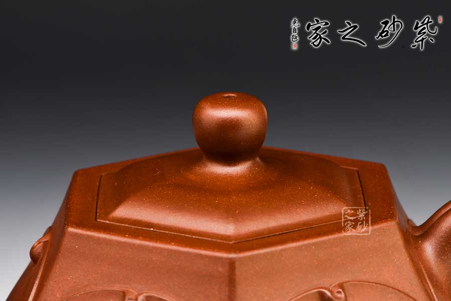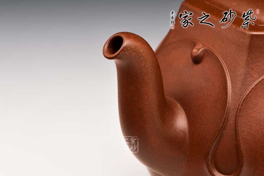 涵蕊壺是袁小強(qiáng)老師的創(chuàng)新力作。壺身造型極其大膽。身分兩部,上部形制六方,下部形制圓器,方圓結(jié)合,意為圓滿順利。同時(shí),身分內(nèi)外,內(nèi)里方圓,外部點(diǎn)綴花器的藝術(shù)效果,仿佛花瓣將整壺包裹,給硬朗的方器線條增添一絲柔和。以圓壺鈕為蕊,意為“含蕊”,與壺名相呼應(yīng)。