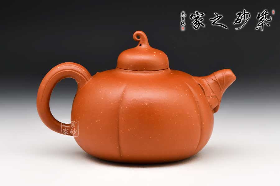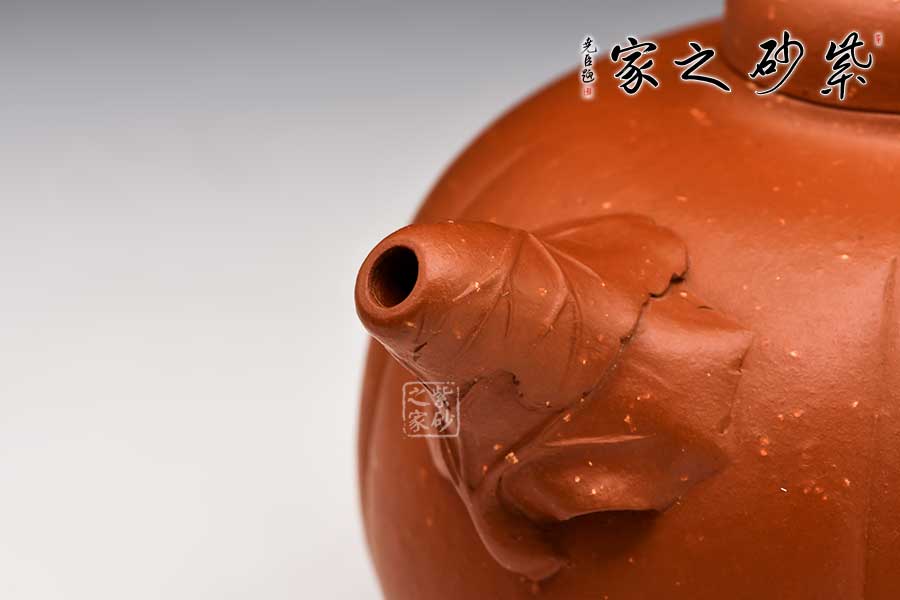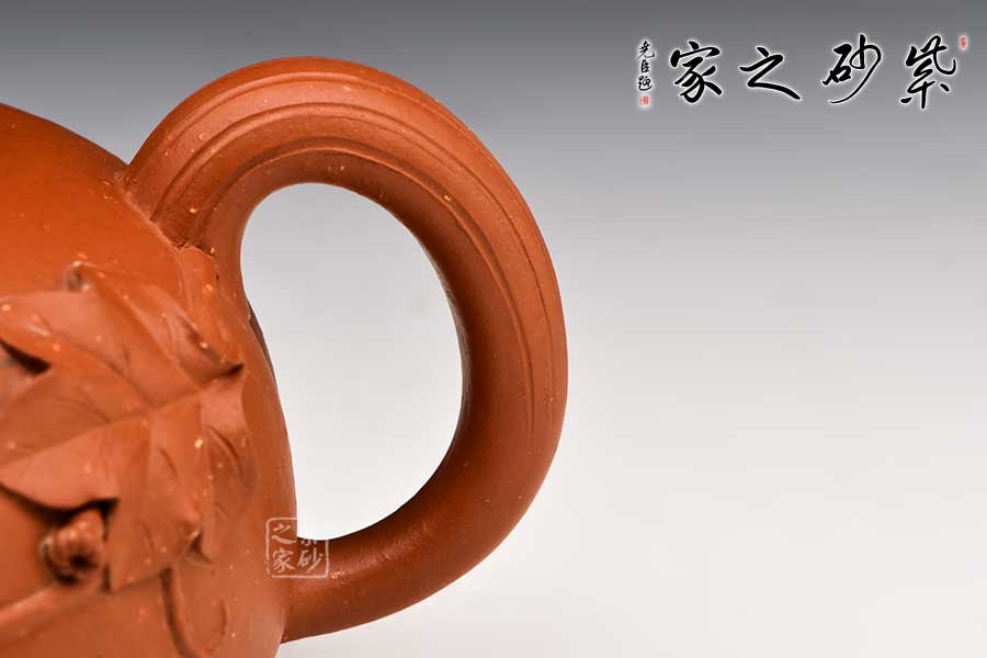 壺身圓潤(rùn),分六瓣,囊線清晰,挺闊飽滿。壓蓋設(shè)計(jì),壺蓋氣韻豐沛。瓜形鈕蜷曲自然,造型小巧而精致。瓜葉包裹為壺嘴,瓜藤?gòu)澢鰤匕选?/span>