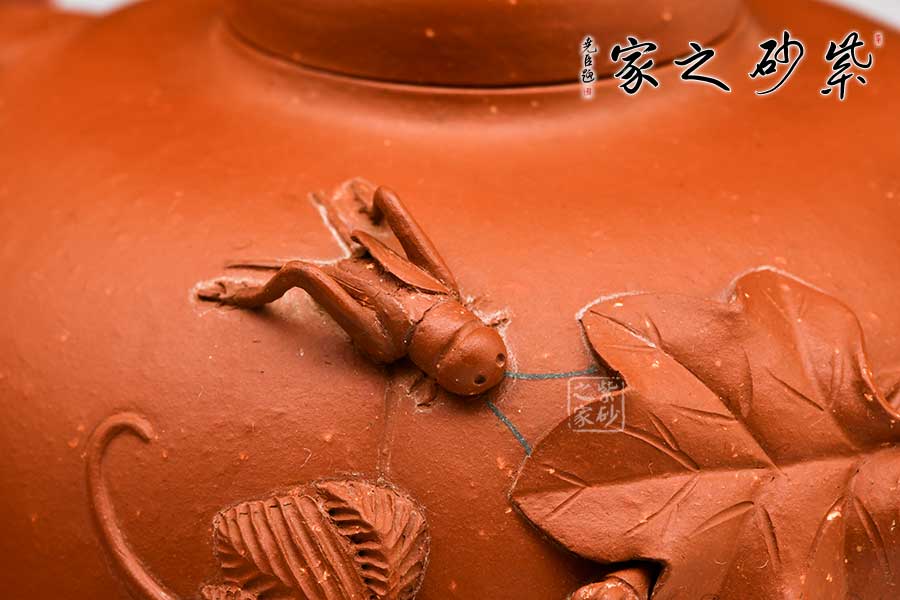 最妙還是壺把胥出筋葉裝飾壺身,瓜葉、瓜蔓,一點(diǎn)小小的花朵在葉片遮掩下仿若隨風(fēng)搖動(dòng)。一只趴伏著的蟋蟀伸出觸角,放佛在垂涎綠色的瓜葉。生動(dòng)細(xì)致中,一派田園情趣!
