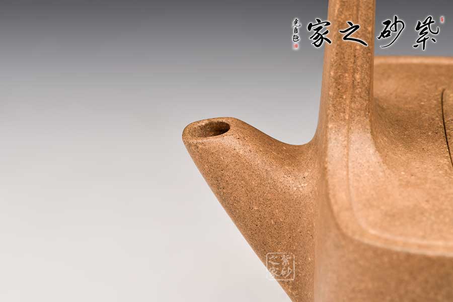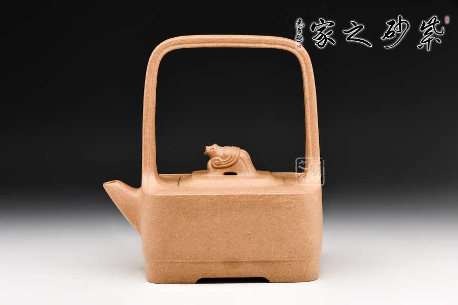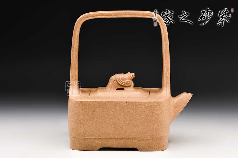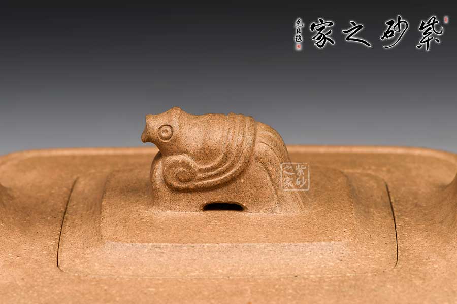 器身呈扁長(zhǎng)方形,方中寓圓,底部置闊帶線,腳以犴門(mén)將壺身托起??诩缫约?xì)方線裝飾,與方提梁呵氣一成。直流方嘴,胥出有力,暗接處理。長(zhǎng)方嵌蓋,中間以泥片筑一平臺(tái),上塑漢代玉雕鳥(niǎo)形紋,在提梁中間產(chǎn)生動(dòng)感,藝趣橫生。