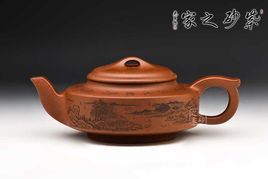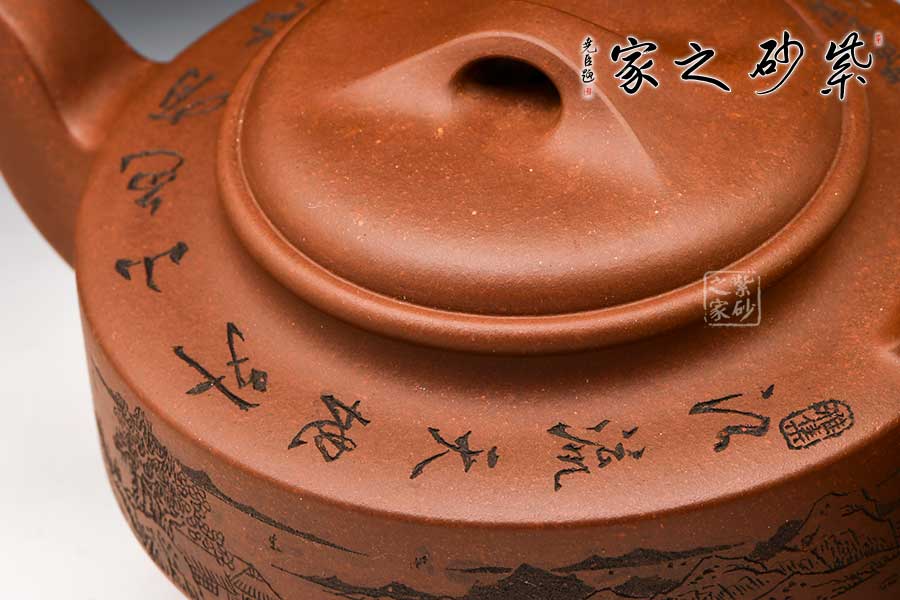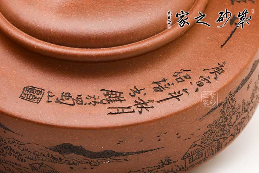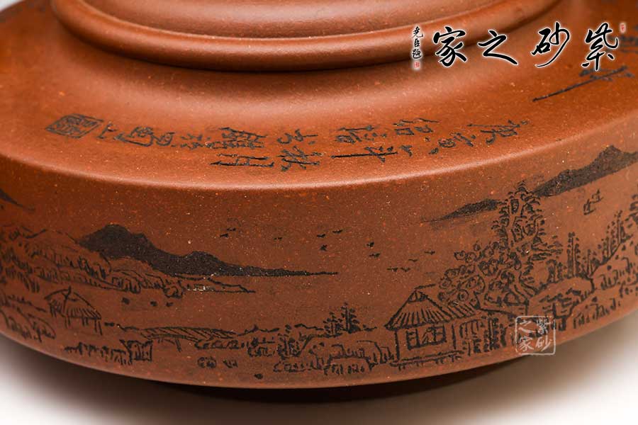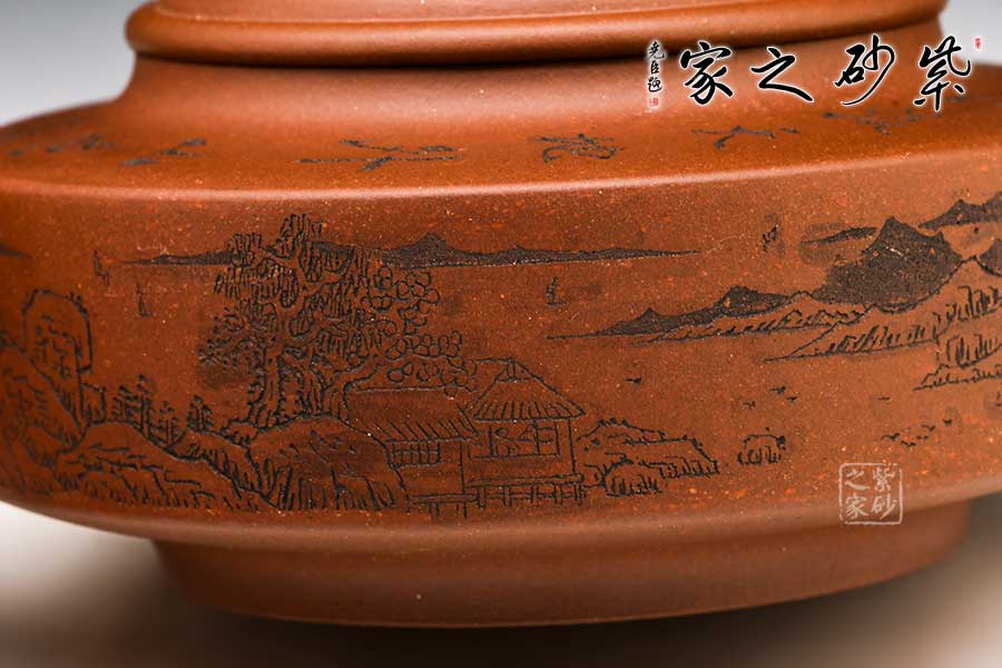 壺身山水刻繪,細膩精良,似工筆臨摹,且雕且琢,渾然天成。