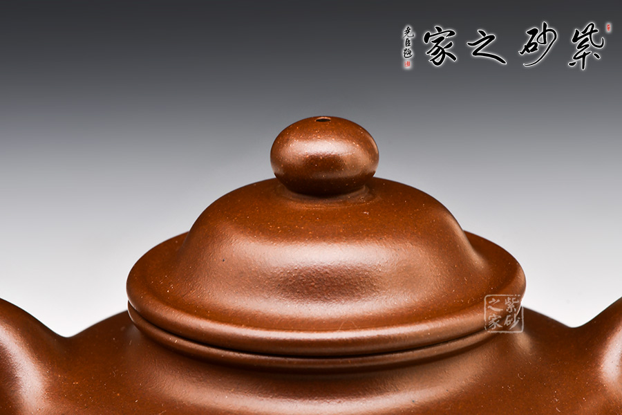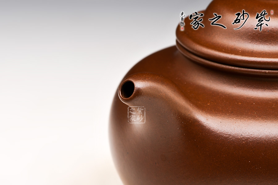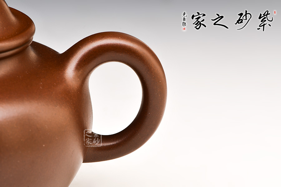 此壺是臨摹之作,其制式來源于顧景舟大師所制“掇球壺”,顧氏“掇球壺”風(fēng)格獨(dú)具,比之邵大亨之“掇球壺”略顯內(nèi)斂,比之程壽珍之“掇球壺”則更顯古樸,可謂博采眾家之長。