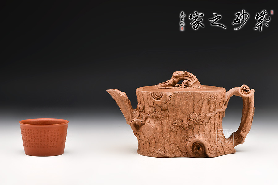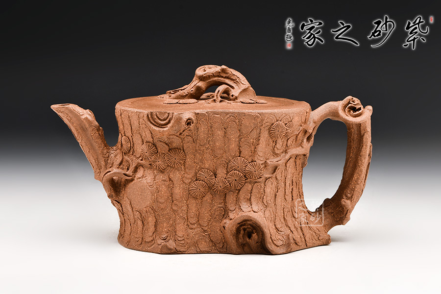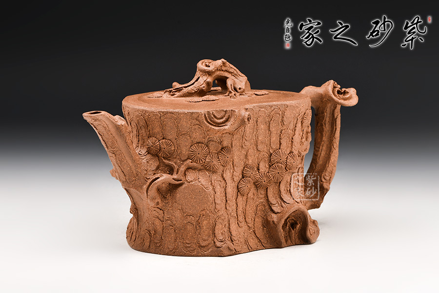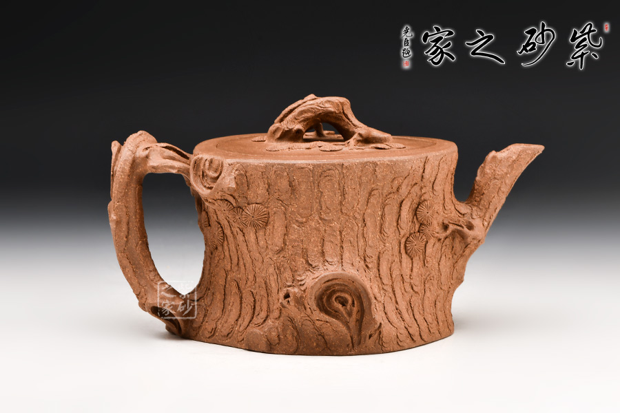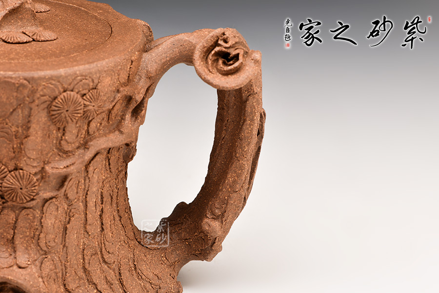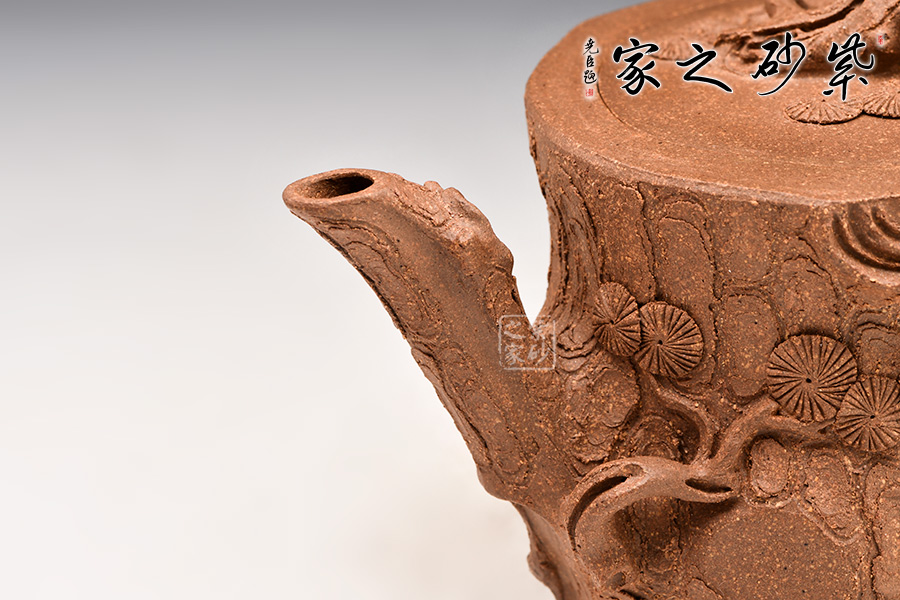 該壺造型為一截松段,通體作松樹(shù)樁形,表面斑駁嶙峋,樹(shù)皮縱橫,老味十足,逼真自如。壺流與把手以松樹(shù)枝巧塑而成,枝干、樹(shù)癭刻劃精細(xì)入微,自然生趣。