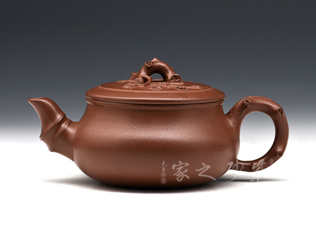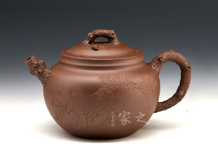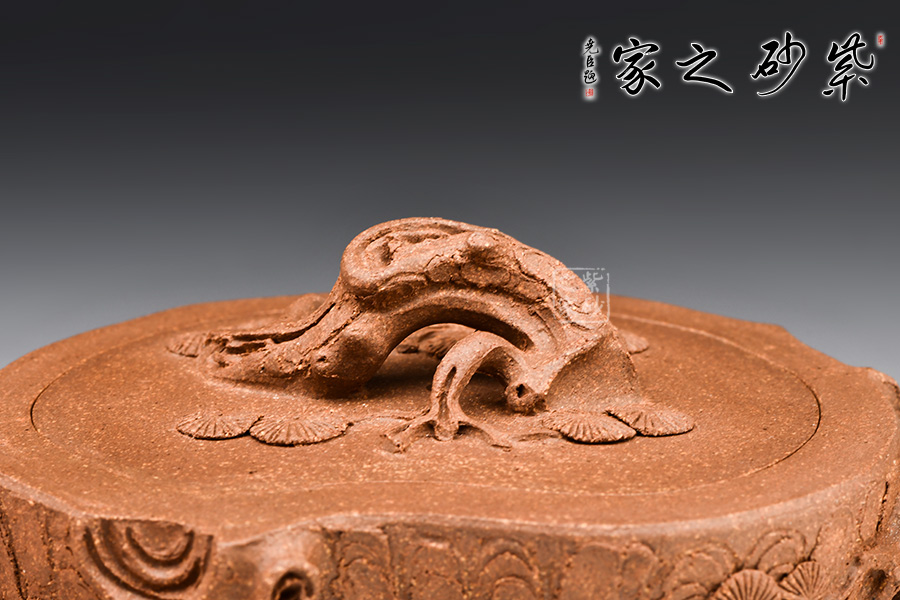 蓋以松樹(shù)枝作鈕,與壺腹渾然一體。原礦段泥作胎,色澤柔和,質(zhì)堅(jiān)溫潤(rùn),整壺形意俱佳。