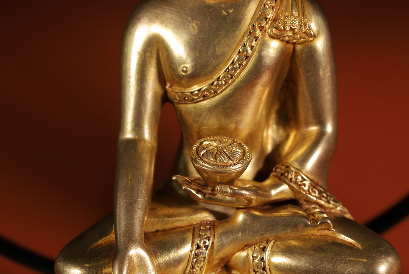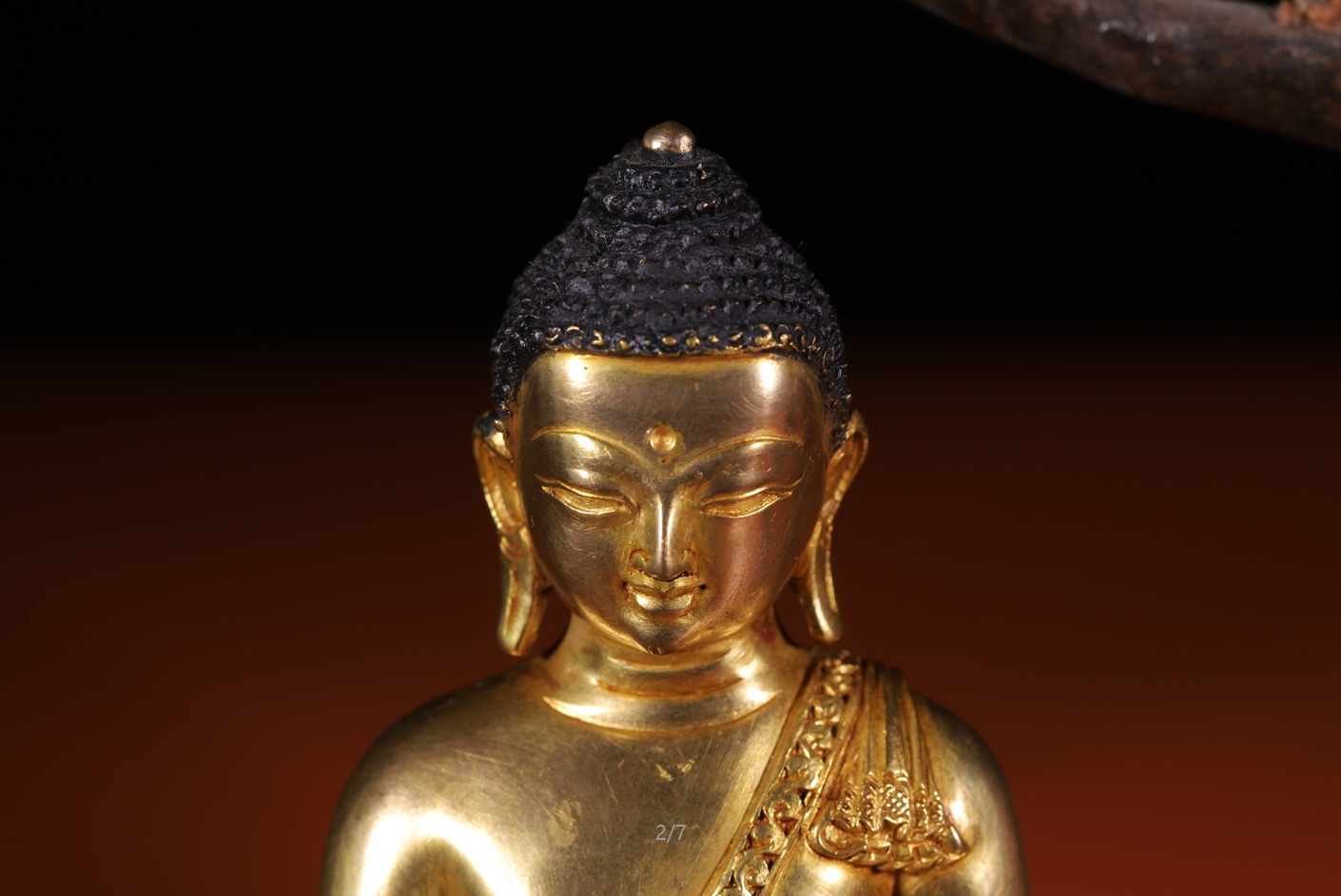 產地:尼泊爾佛像 工藝:鎏金 創作年份: 題材:釋迦牟尼 繪制時間:0日 尺寸:14cm 重量:0 g 材質: 使用場地: