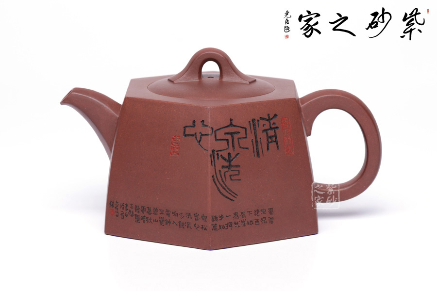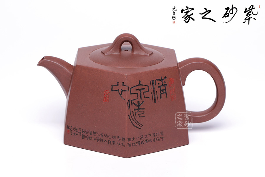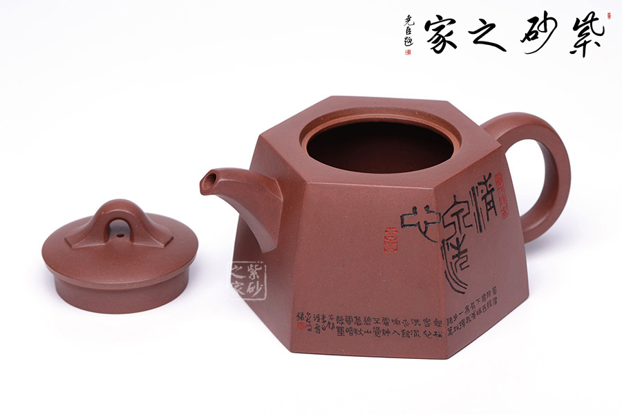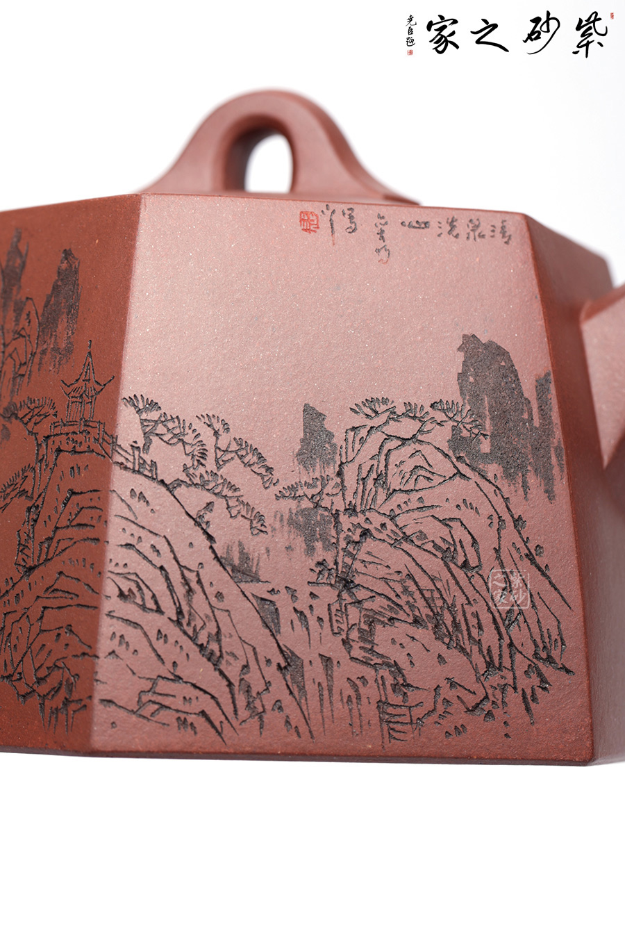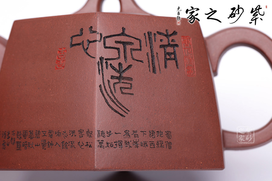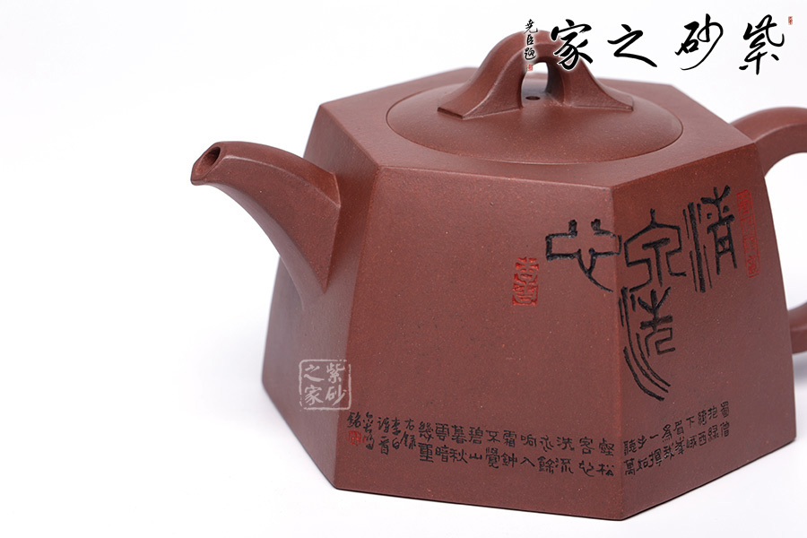 此壺從線到點,從點到面,面面俱到。壺身雙面裝飾,刻字龍飛鳳舞,刻畫一氣呵成,灑脫而又流暢。