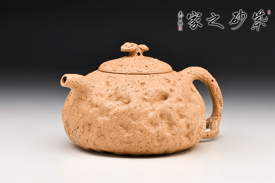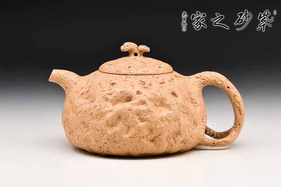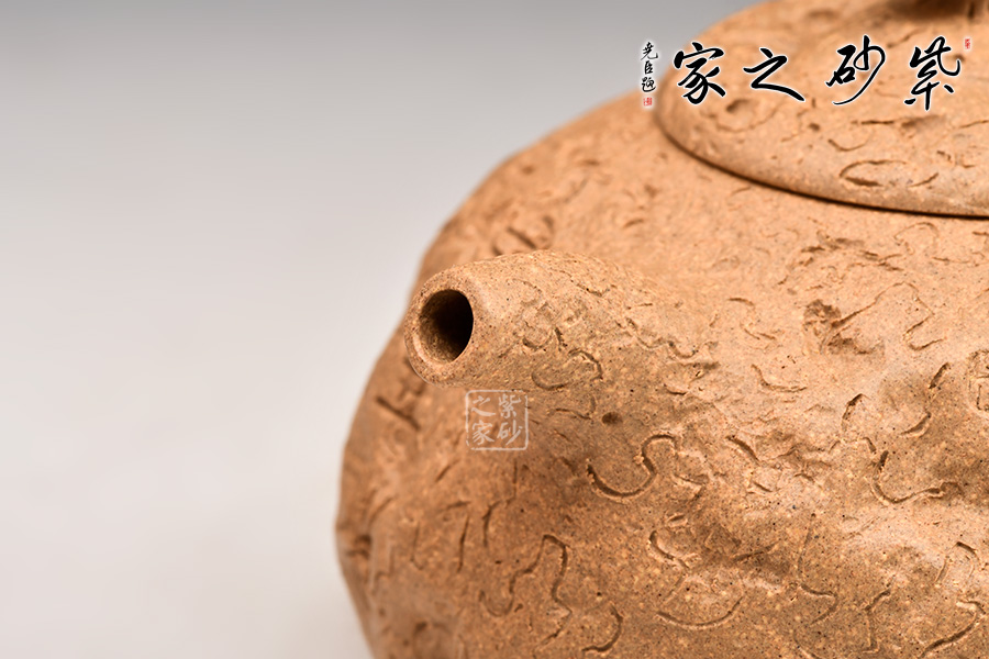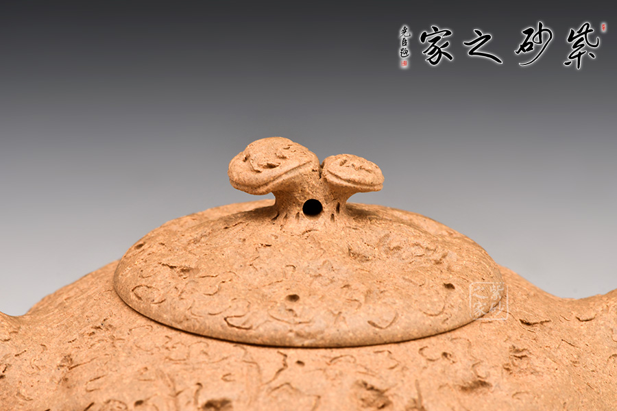 吳德榮老師所做的這把仿供春壺,以本山段泥為料,色澤鮮亮,質(zhì)堅溫潤。壺體表面的風(fēng)化,樹紋開裂的精雕,樹干的百年滄桑,枝節(jié)的老辣,到處流露出作者追摩自然的情愫,文人情懷躍然而出。以靈芝為壺鈕,仿若老樹又煥生機,富有靈氣。