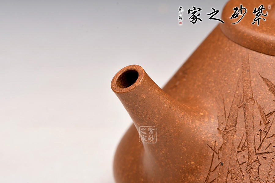 整器選用原礦段泥制作,圍繞三角形形體展開,壺蓋線條豐盈飽滿,橋型壺鈕拿捏舒適。直筒暗嘴,挺括有力,壺把與之對(duì)稱,自然流暢,不失力度。色澤田黃、質(zhì)堅(jiān)溫潤(rùn),隱有光澤,入手可鑒。