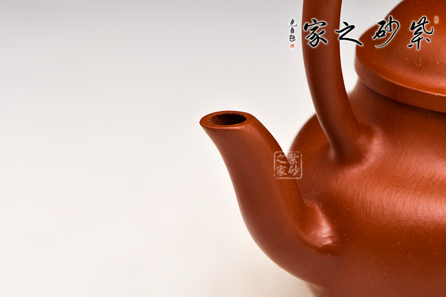 流孔處于壺身中心線,二彎嘴出水流暢、干凈,提梁回旋有力,與壺肩緊密相連。