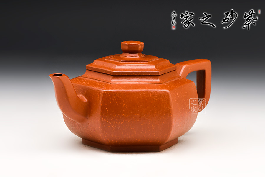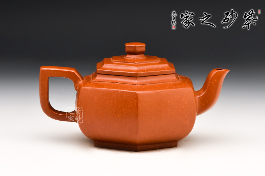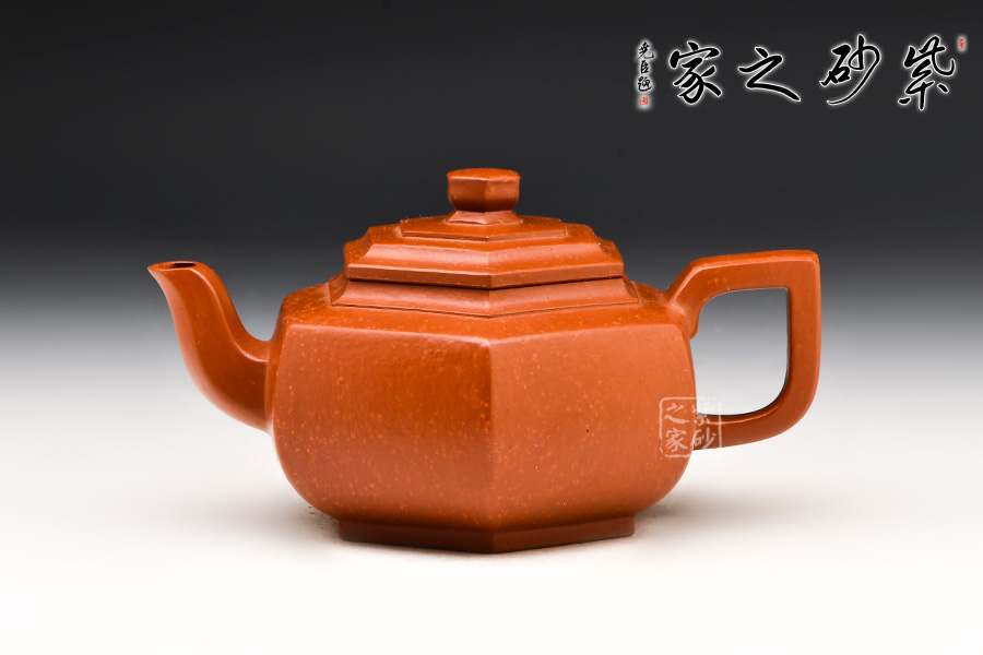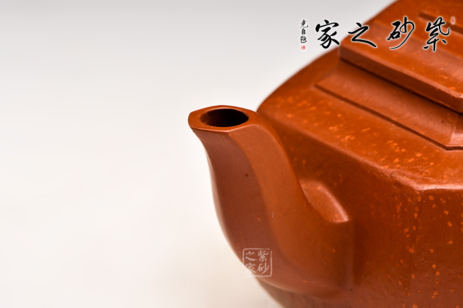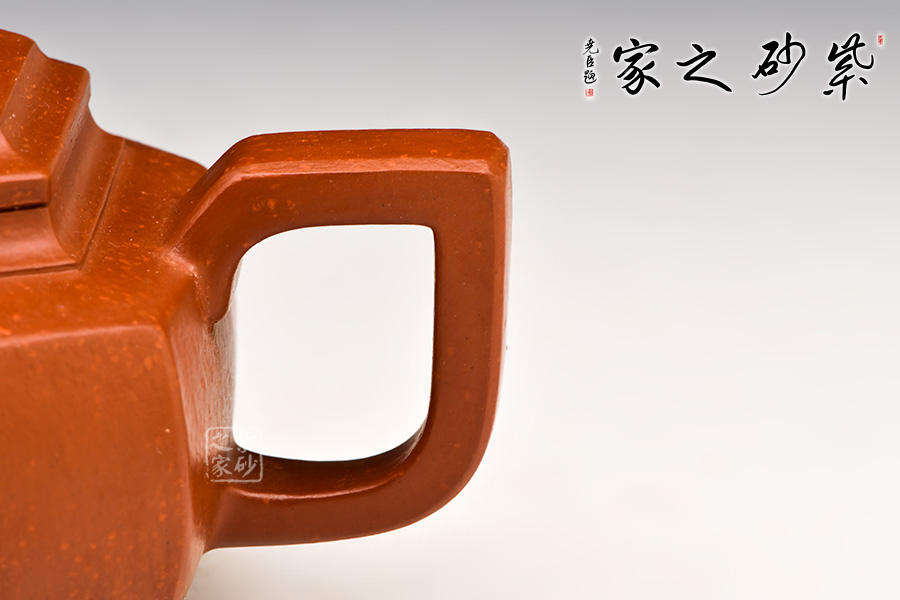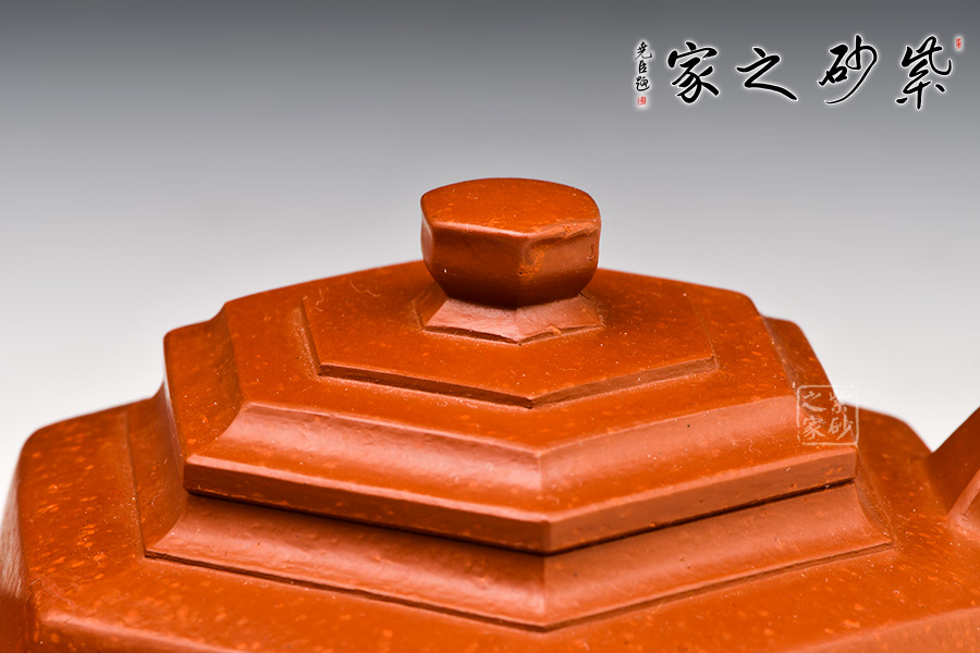 嘴與把在同一水平線,嘴型呈六方,又彎曲有度;壺鈕呈六方蓮子形狀,吉祥如意;把呈四方,轉(zhuǎn)折有力度,端握舒適稱手;