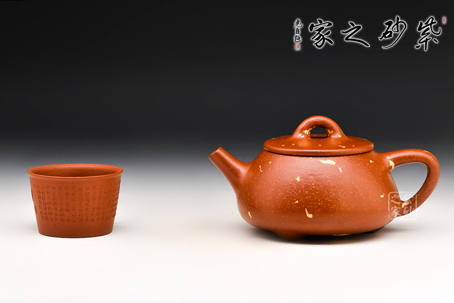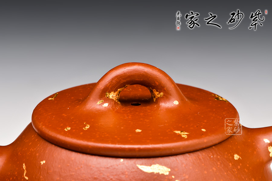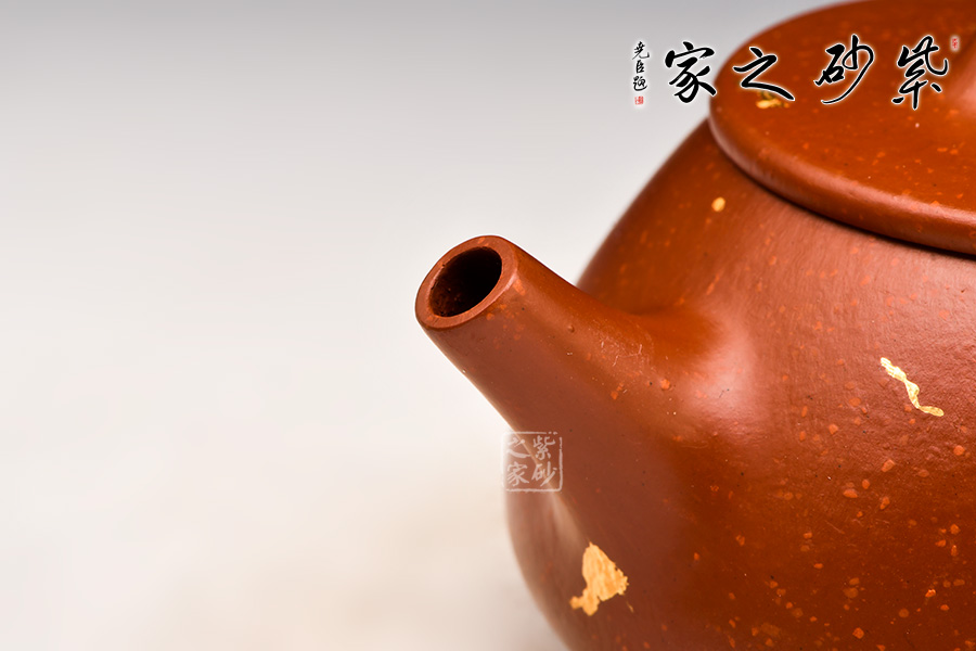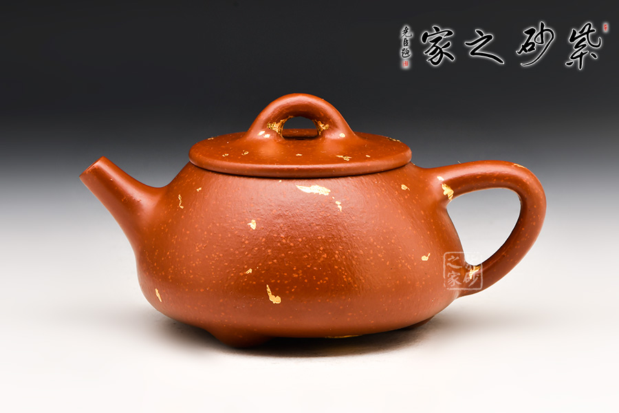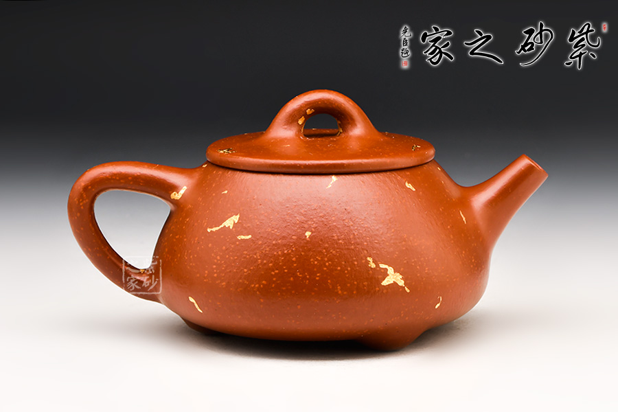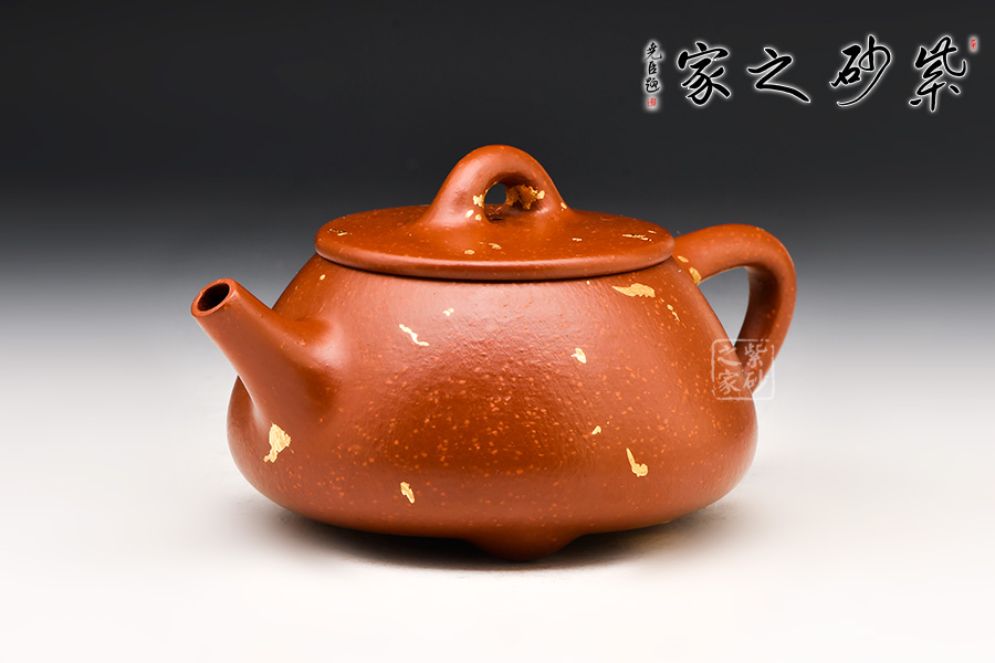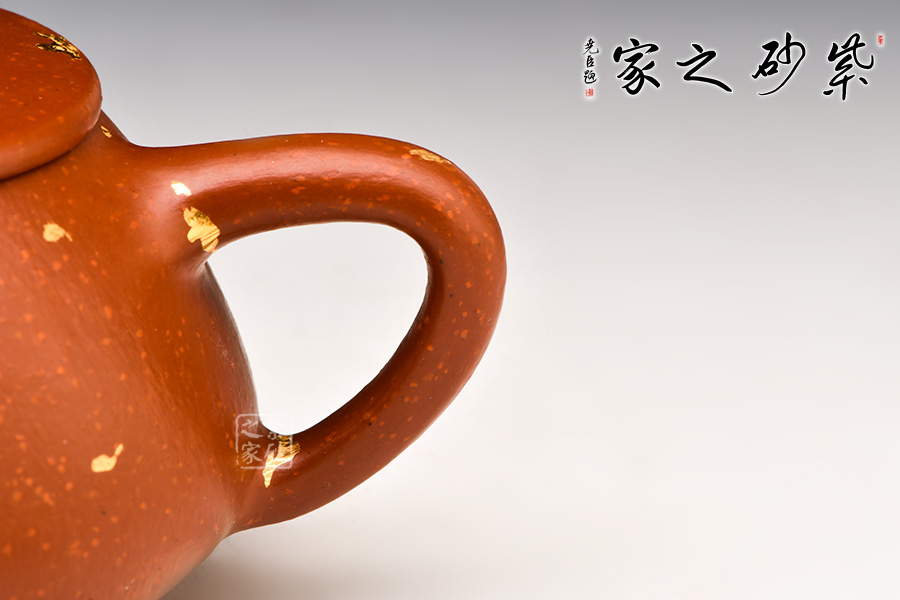 此款石瓢壺在繼承傳統(tǒng)的基礎(chǔ)上加于創(chuàng)新,壺身加以灑金裝飾,點(diǎn)到為止而不庸俗,使茗壺既保持傳統(tǒng)文化的雅,又突出紫砂的高貴美感。
