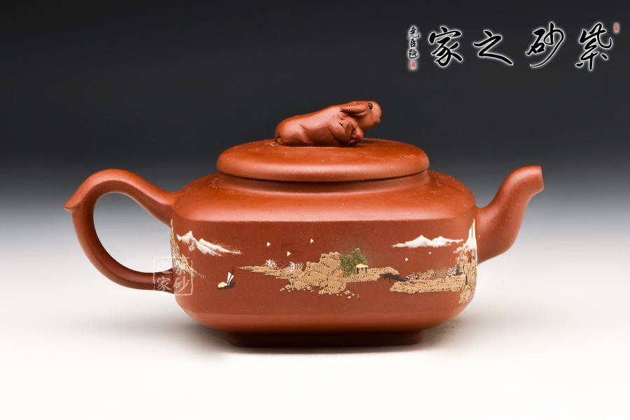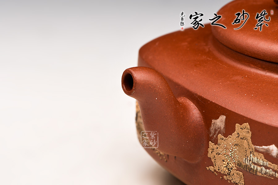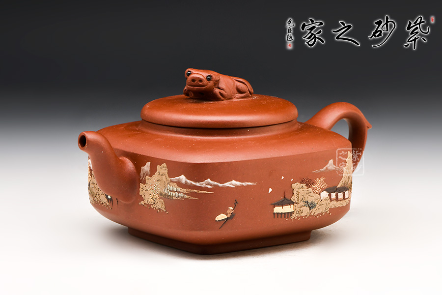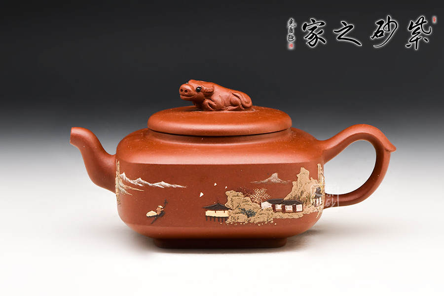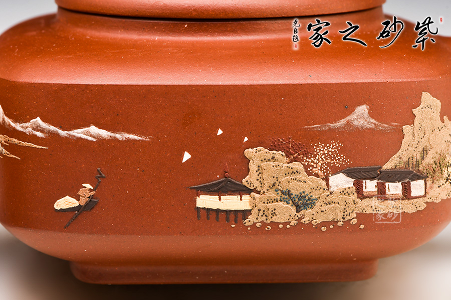 壺身挺括,泥繪呈現(xiàn)出一幅山水亭臺圖,山高水長、漁人悠閑自得,讓人如臨古人之境,身心皆放松。