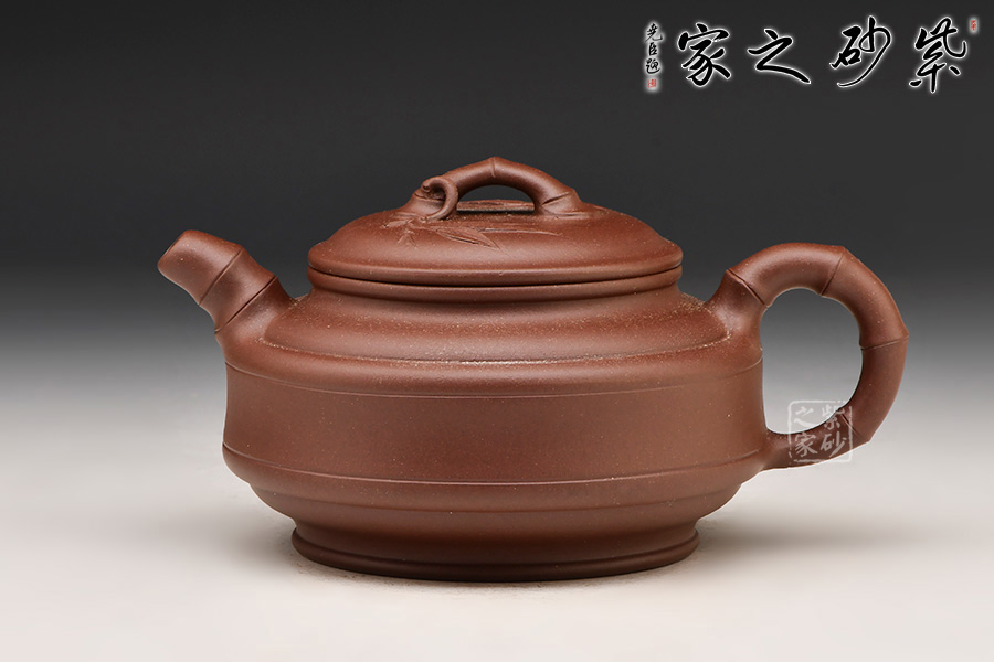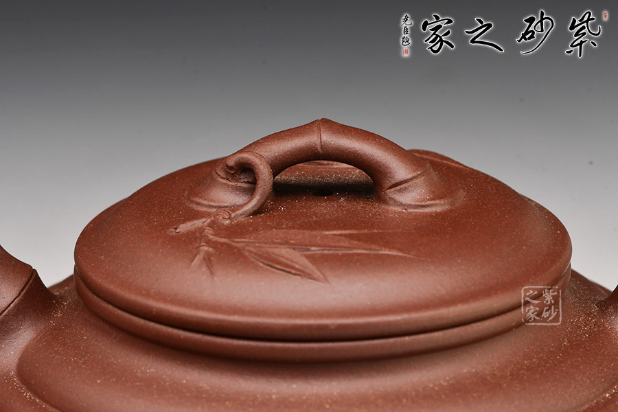 雙線竹鼓壺是一種傳統(tǒng)壺式。其器形工整,雍容大方。特點(diǎn)是壺身如鼓狀,上出斜肩,下腹斜收,底有圓足。若一竹節(jié),一彎式竹鞭狀壺嘴,細(xì)竹式圓形狀壺把,采用壓蓋式結(jié)構(gòu),壺蓋為圓弧式,竹節(jié)形橋式蓋鈕,鈕下貼塑竹葉紋飾,生動(dòng)有力。