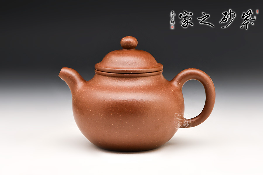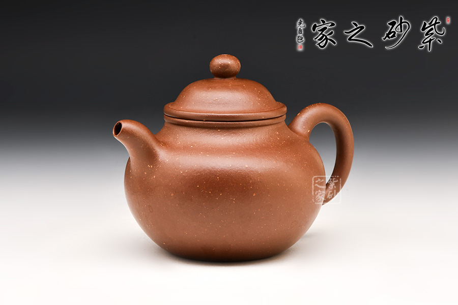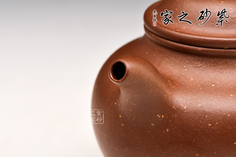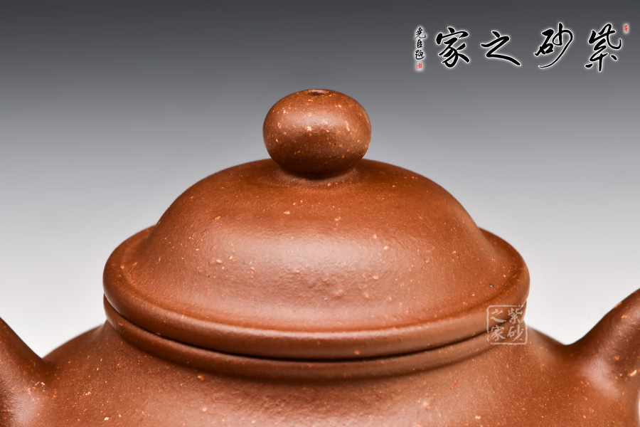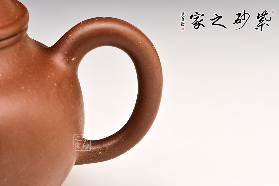 此壺壺身飽滿,端莊大方;口蓋線圓潤精細,整體樸拙渾厚,彎流嘴自壺身而出,耳形把持握有力;寶珠鈕精致小巧,有畫龍點睛之感。