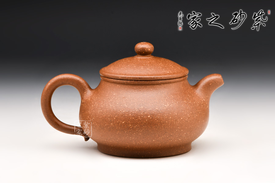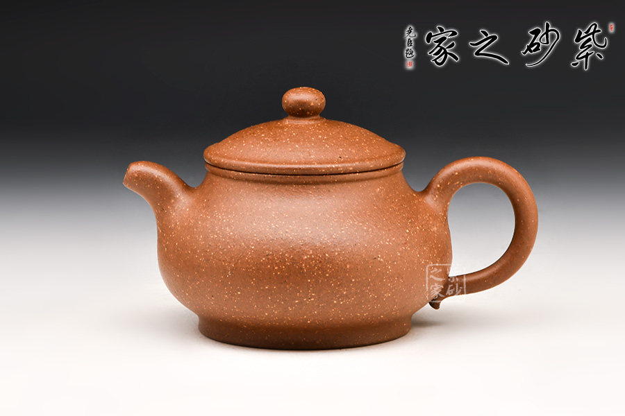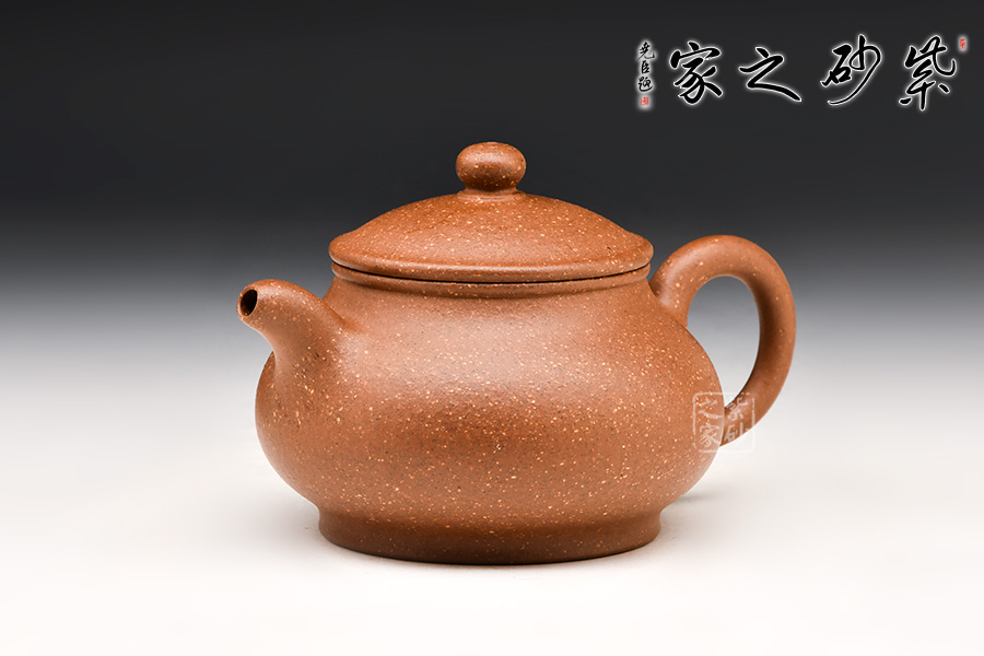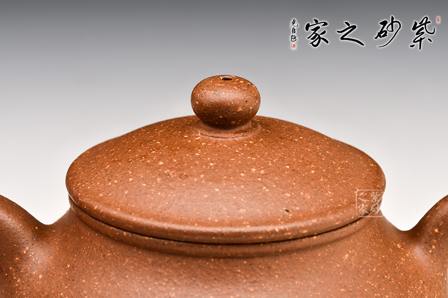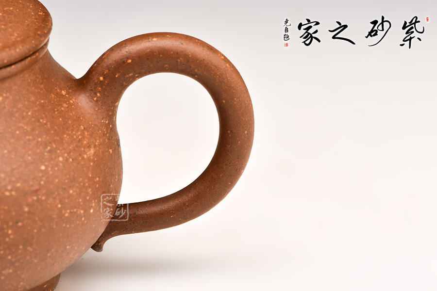 此壺選用豆沙段泥手工制作,色澤溫雅。壺身飽滿,壺底與壺口口徑一致,形成上下應(yīng)和之勢,一彎嘴自壺身而出,耳形壺把生動柔韌,寶珠鈕立于壓蓋之上,協(xié)調(diào)有致。