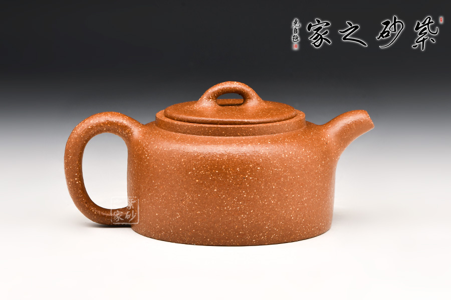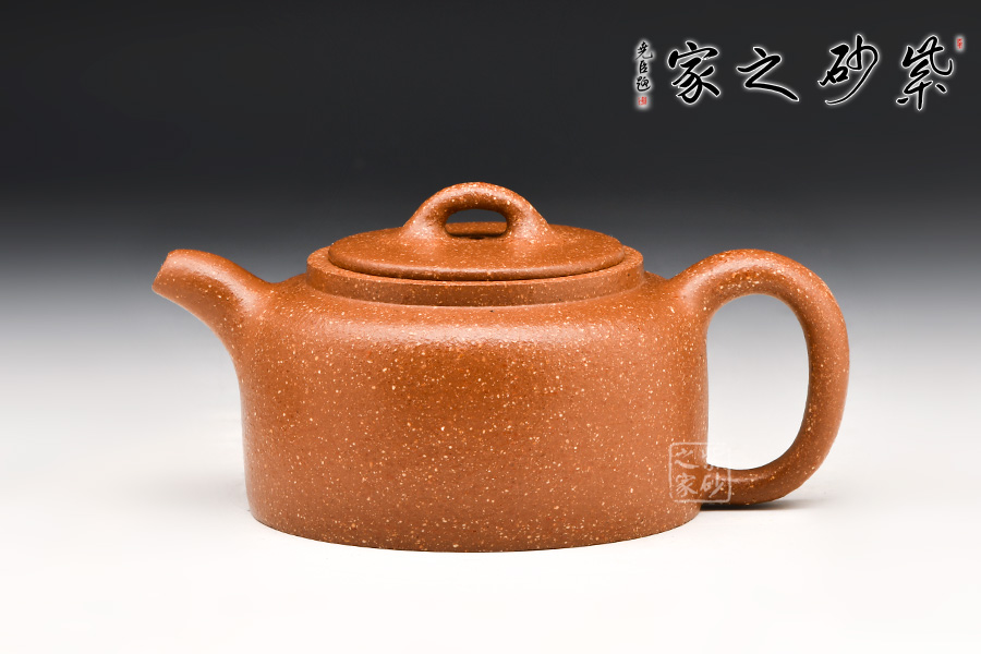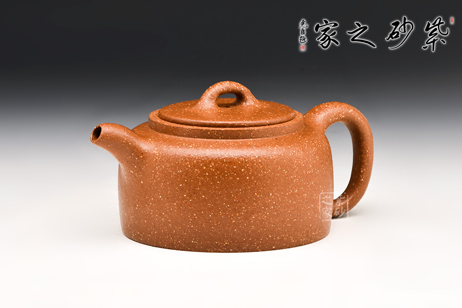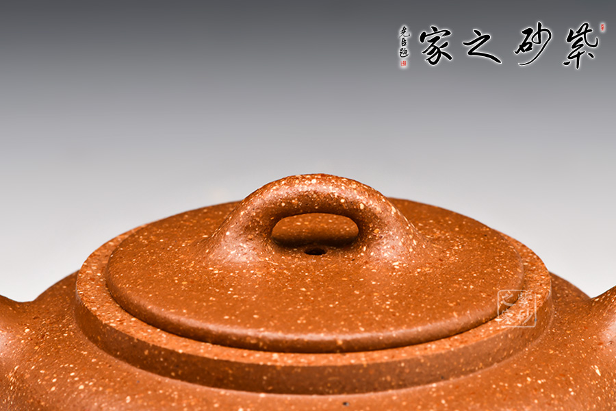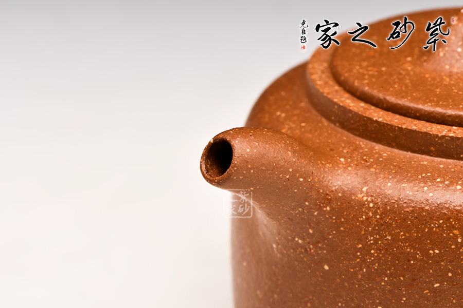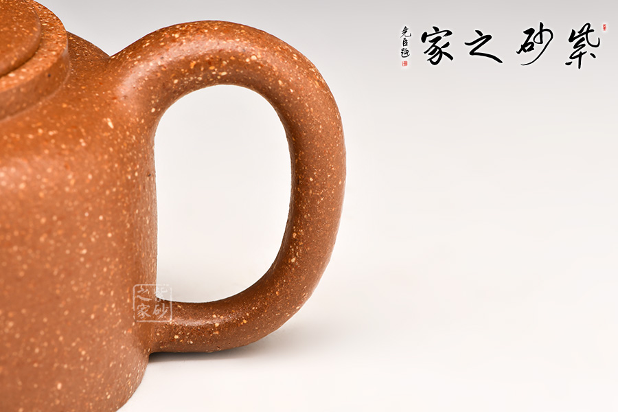 此壺壺身較矮但敦厚飽滿,橋型鈕與平蓋自然銜接,一彎嘴出水爽利干凈,耳形把略大,抓握方便。整器簡約大方,線條流暢,給人古樸厚重之感。