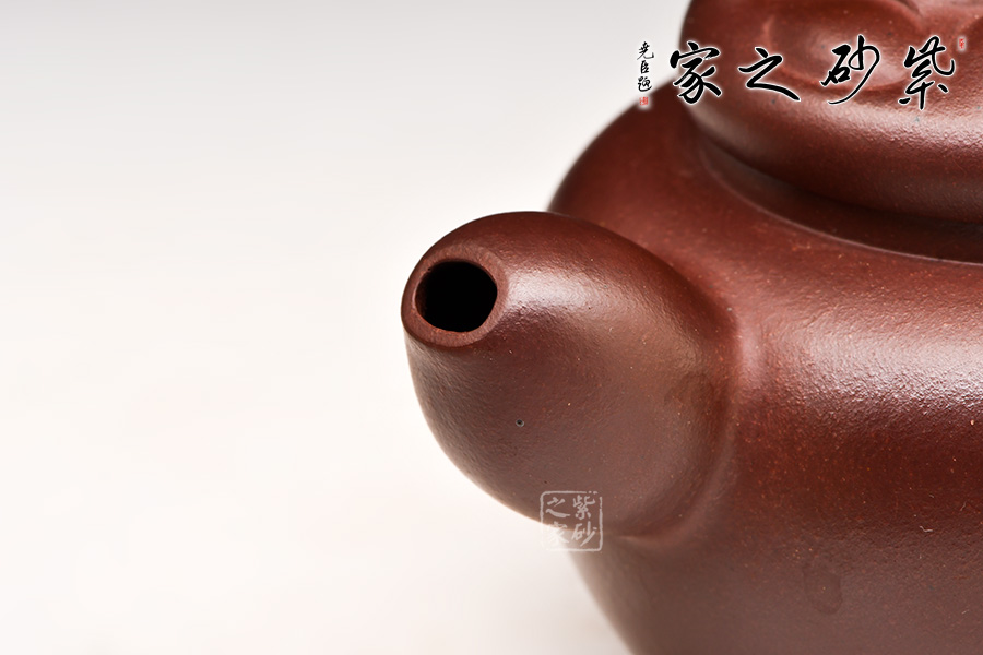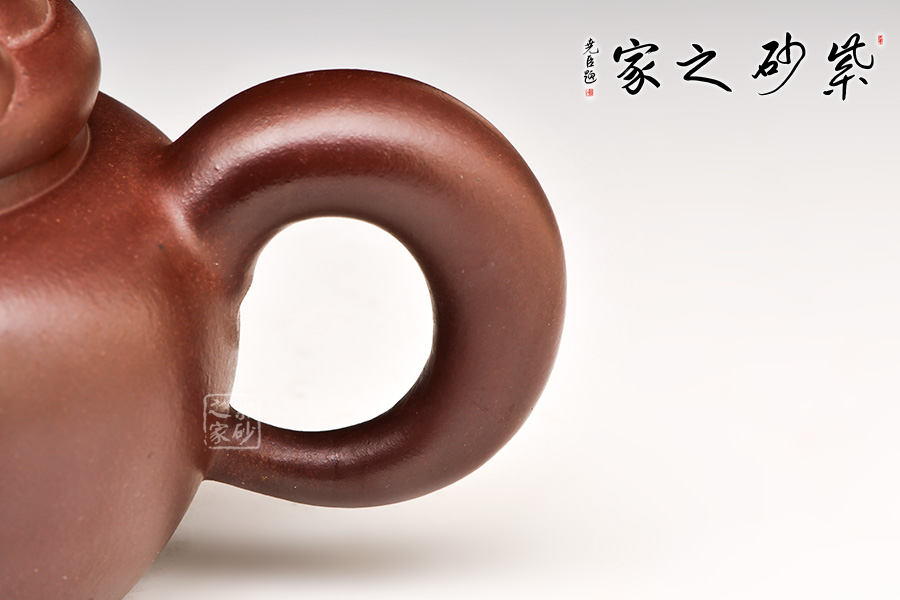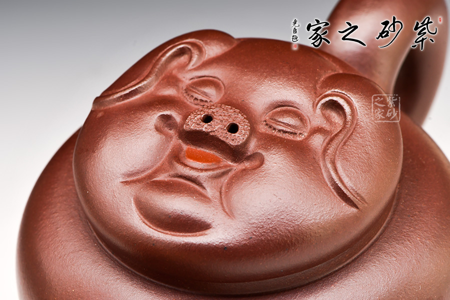 壺身圓潤(rùn)飽滿,壺把和壺嘴的造型獨(dú)特,壺把環(huán)形,渾圓厚重,壺嘴與把相契合,出水有力。值得一提的是,此壺的亮點(diǎn)在于蓋鈕一體,壺蓋厚重,上有一只福豬,肥頭大耳,民間自古以肥豬為福相,肥頭大耳更是福氣的象征。