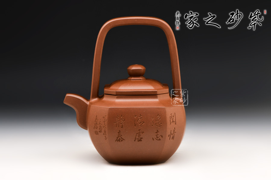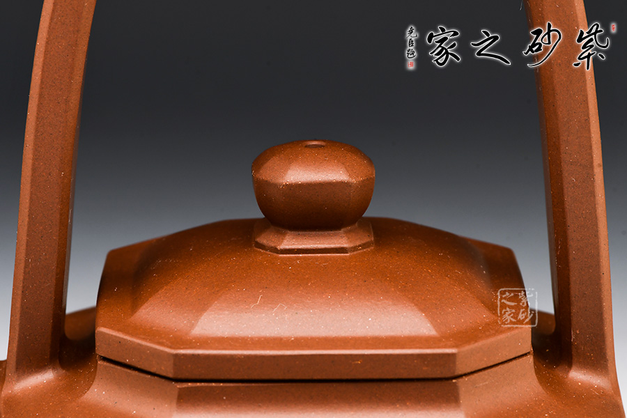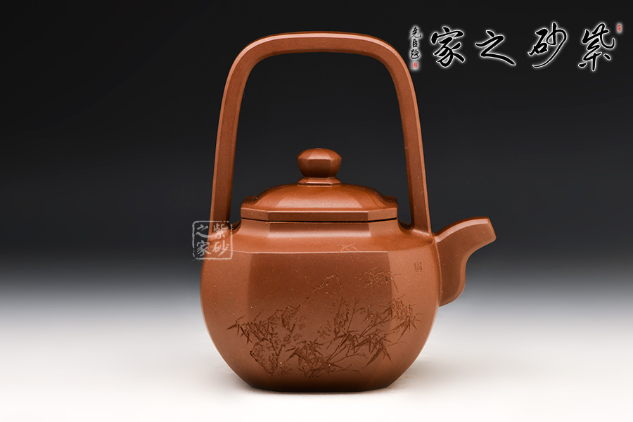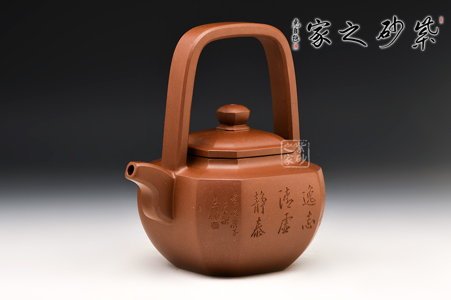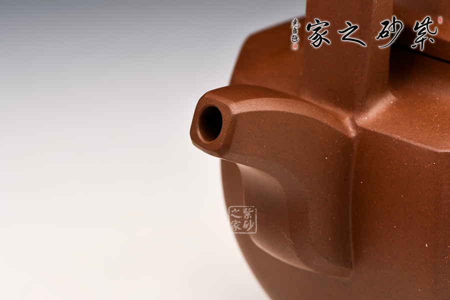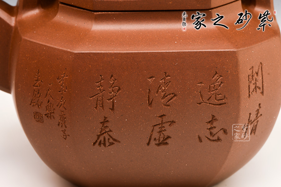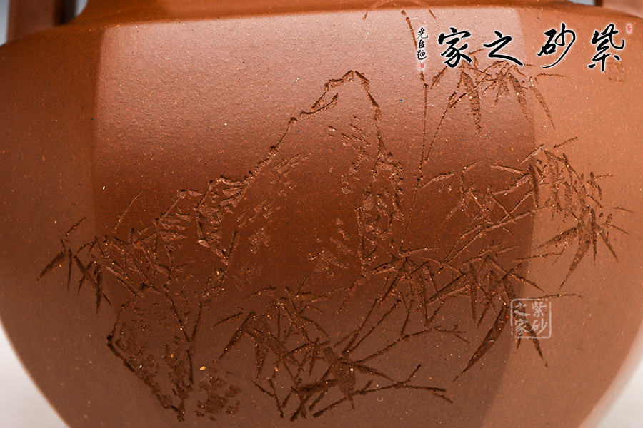 此作為父子聯(lián)手合作款,刻繪由王福君先生之子——王智明(譚泉海大師入室弟子)裝飾,整器爽凈精當(dāng),線(xiàn)條挺拔過(guò)渡自然,與壺體線(xiàn)條互相呼應(yīng),流暢美觀(guān)。壺形雄偉剛正,方中寓圓。