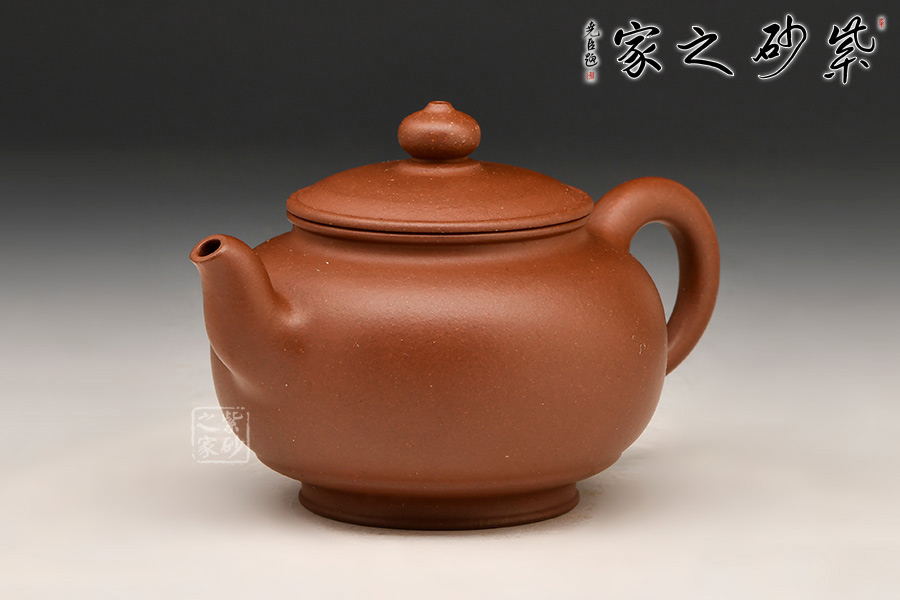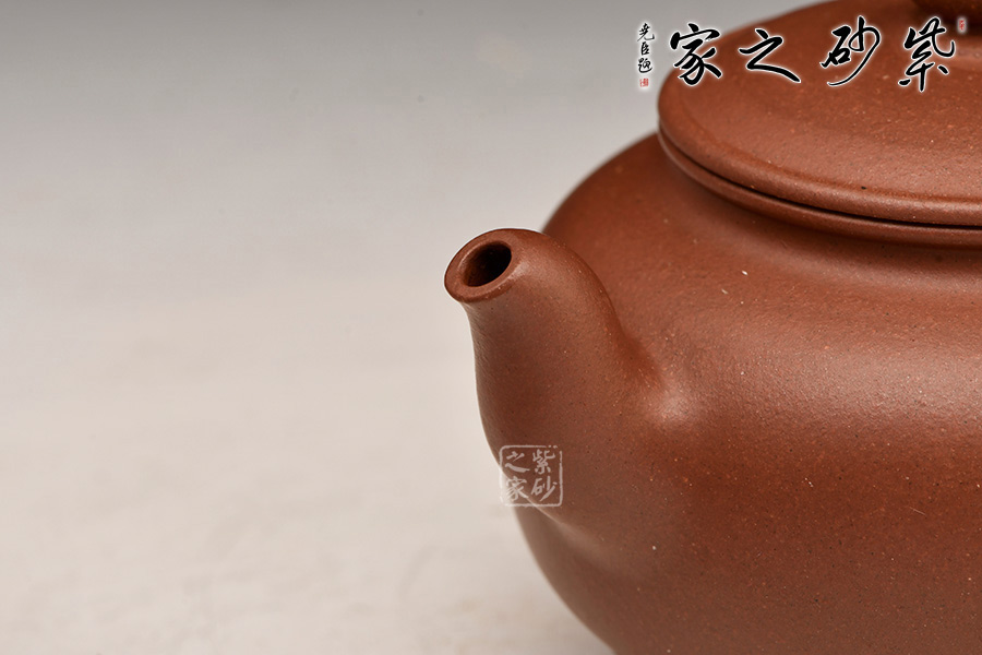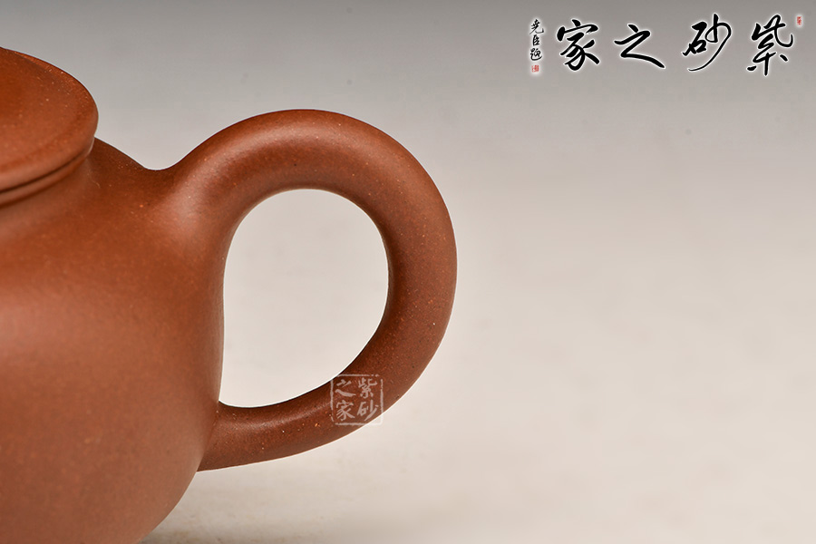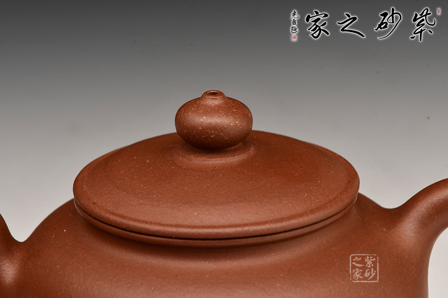 壺身極為飽滿(mǎn)柔和,壺底圓潤(rùn),滑肩,壺口開(kāi)闊而平整,平蓋設(shè)計(jì)呈圓鼓之形,蓋面飽滿(mǎn)上凸,壺鈕如明珠;壺嘴暗接彎流,壺基豐厚,銜福而至;耳形端把寬和大氣,持握舒適。