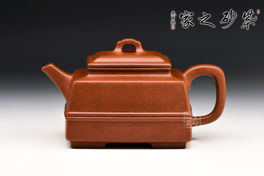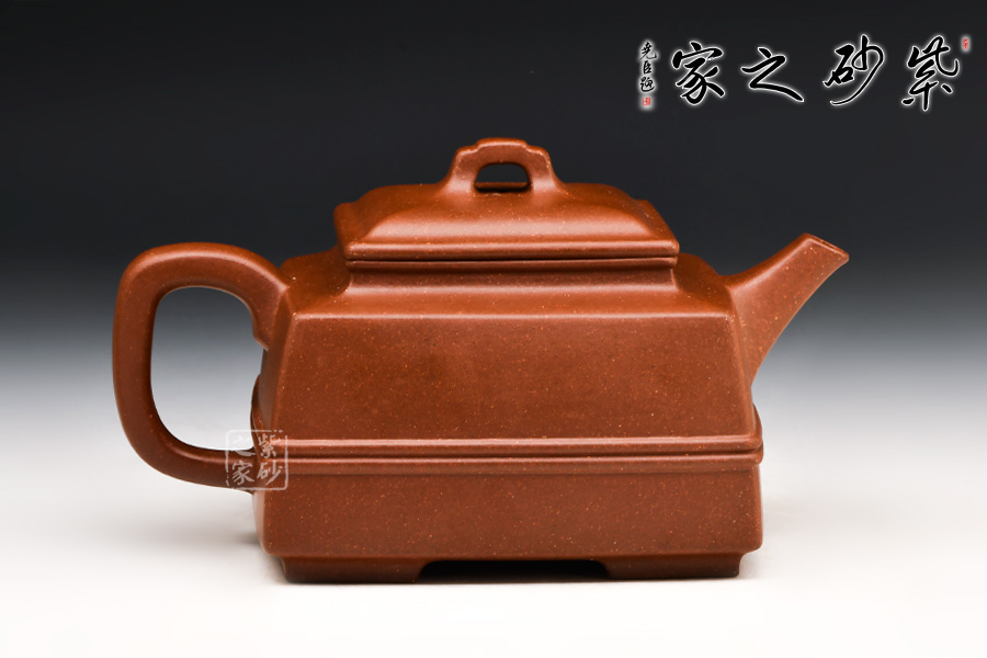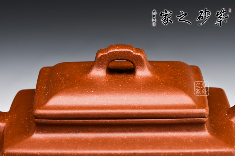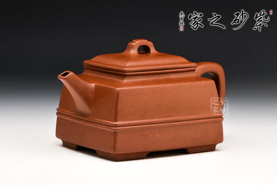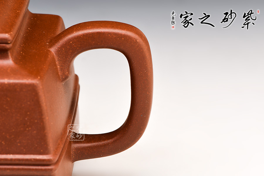 此壺四方平蓋,梯形四方壺身,由下至上漸漸收斂,以雙腰帶束之,整器層次感十分強烈;壺把方中見圓,四方直嘴強勁有力;壺蓋規(guī)則挺括,橋鈕立體感極強。