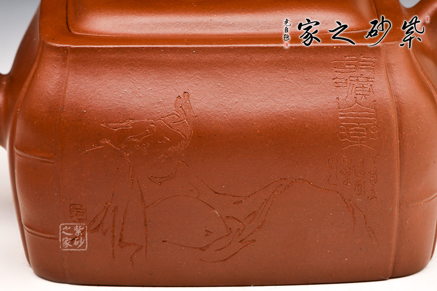 此涵方壺由原礦紫泥煉制而成,成熟穩(wěn)重、端莊肅穆。壺身方圓結(jié)合,敦實(shí)厚重,鈕、流與把均為竹節(jié)樣,可謂匠心獨(dú)運(yùn)。壺身正面刻有一閑翁趣圖,背面則刻有“無(wú)盡藏”三個(gè)字,筆力蒼勁。