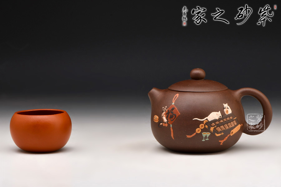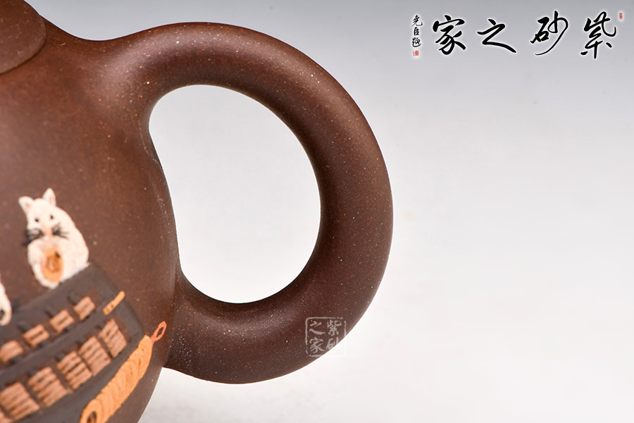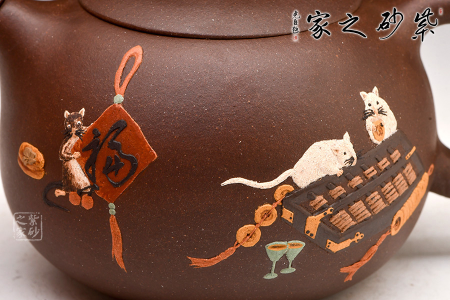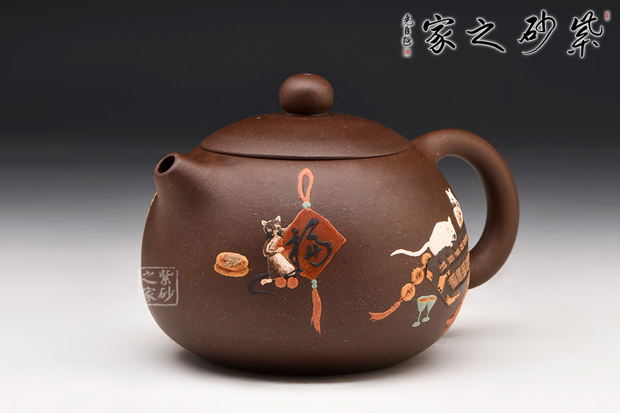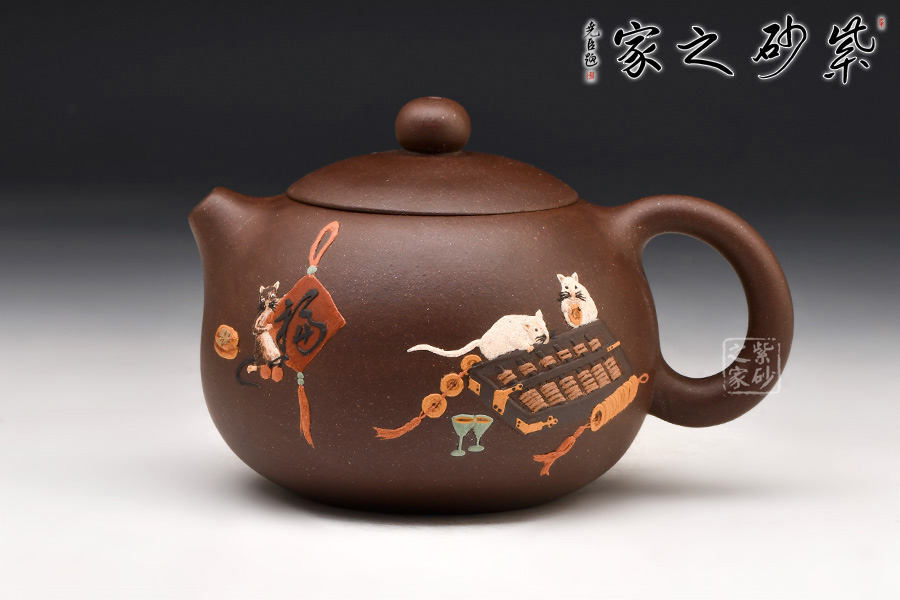 西施壺雙面泥繪裝飾,刻畫老鼠小巧可愛,場景極富活力,令人會心一笑,忍不住把玩。