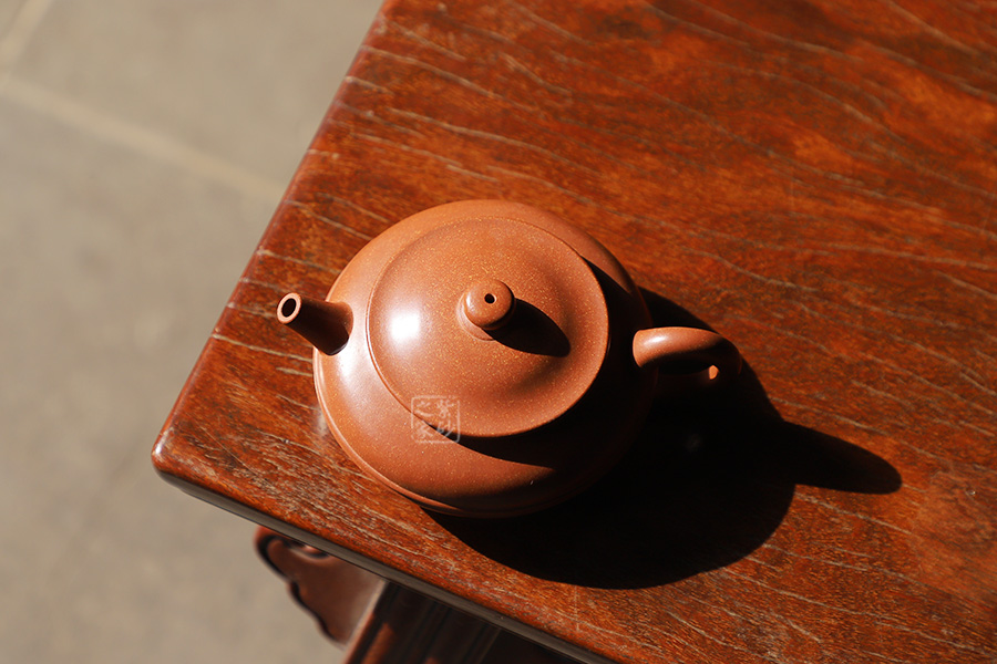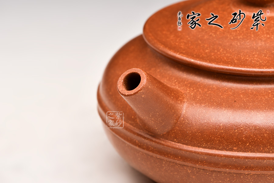 此款壺壺身扁圓,重心下垂,上輔以腰線,線條流暢,骨氣盡顯。短直嘴自壺身挺翹而出,簡潔有力,寶珠鈕、壓蓋更像壺口蓋了一頂帽子。整壺線條挺括流暢,施藝嚴(yán)謹(jǐn),古潤優(yōu)雅,為老師不可多得之佳品!