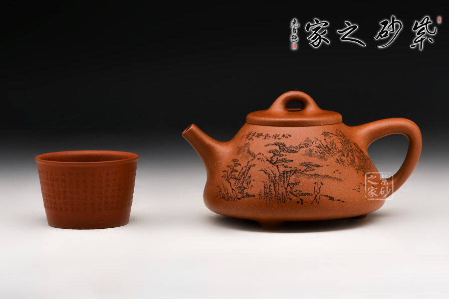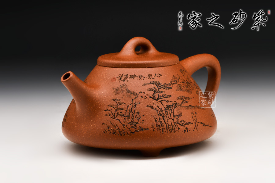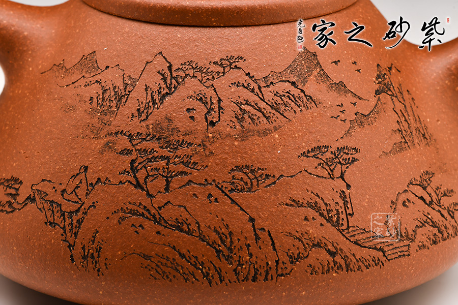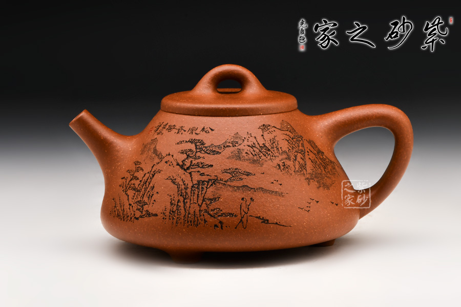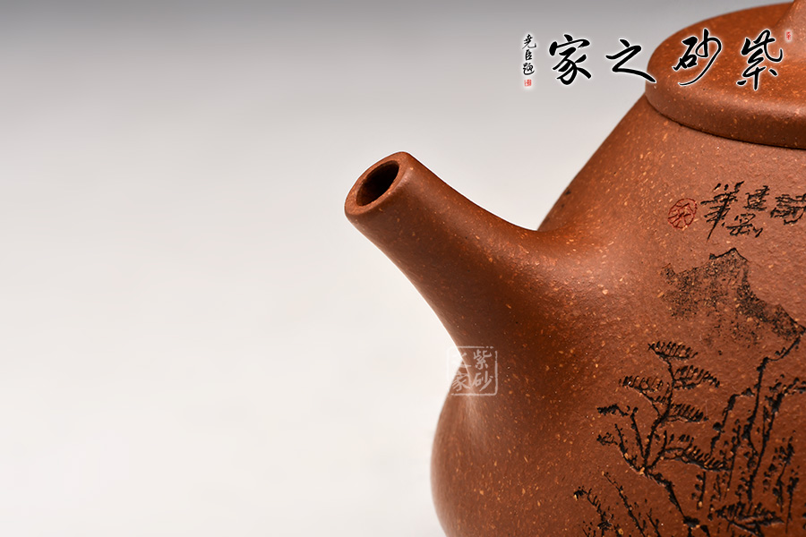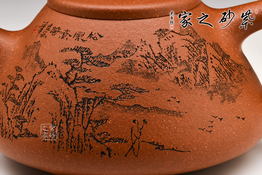 壺身刻有一幅蒼勁的松樹圖,加上“松風(fēng)煮詩”幾個字,生活中的文雅逸趣躍然壺上。